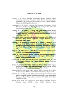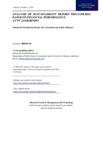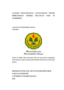 Alhaniyah Nurshabrina Rozak. 2024. 1704519032. Analisis Pengungkapan Sustainability Report Berdasarkan Kinerja Keuangan Pada PT Jamkrindo. Skripsi. Program Studi Sarjana Terapan Akuntansi Sektor Publik. Fakultas Ekonomi. Universitas Negeri Jakarta. Penelitian ini bertujuan untuk menganalisis kinerja keuangan dengan menggunakan rasio profitabilitas, solvabilitas, dan likuiditas serta menganalisis pengungkapan Sustainability Report yang terdiri dari aspek ekonomi, lingkungan, dan sosial pada PT Jamkrindo periode 2019-2021. Metode yang digunakan dalam penelitian ini adalah deskriptif kuantitatif dengan metode pengumpulan data sekunder dari seluruh data keuangan pada Annual Report dan Sustainability Report serta informasi terkait lainnya yang tersedia untuk publik yang diterbitkan PT Jamkrindo melalui website perusahaan. Teknik analisis data dilakukan dengan cara menghitung rasio, membuat teknik analisis konten isi pada Sustainability Report, dilanjutkan dengan interpretasi korelasi dari data kinerja keuangan dan Sustainability Report PT Jamkrindo tahun 2019-2021. Hasil penelitian ini menunjukkan bahwa kinerja keuangan pada rasio profitabilitas yang digambarkan dengan ROA dan ROE dari tahun 2019-2021 mengalami kenaikan. Sedangkan rasio solvabilitas yang digambarkan dengan DAR dan DER serta rasio likuiditas yang digambarkan dengan Current Ratio dan Cash Ratio selama tahun 2019-2021 mengalami kenaikan pada tahun 2020 kemudian mengalami penurunan pada tahun 2021. Pada pengungkapan Sustainability Report PT Jamkrindo selama tahun 2019-2021 skor tertinggi pada tahun 2020 dan skor terendah pada tahun 2019. Pada kategori yang ada pada standar khusus menunjukkan bahwa aspek ekonomi lebih mendominasi diungkapkan di antara aspek yang lain. Peningkatan skor pengungkapan Sustainability Report mengindikasikan komitmen terhadap praktik keberlanjutan. Oleh karena itu, dapat disimpulkan bahwa terdapat keterkaitan antara kinerja keuangan yang baik dan peningkatan skor pengungkapan Sustainability Report PT Jamkrindo. Rekomendasi bagi peneliti selanjutnya adalah peneliti diharapkan dapat menggunakan beberapa perusahaan sejenis, untuk melihat bagaimana kinerja keuangan dan pengungkapan Sustainability Report dari beberapa perusahaan sejenis. Kata Kunci: kinerja keuangan, pengungkapan sustainability report, perusahaan penjaminan, praktik keberlanjutan, PT Jamkrindo