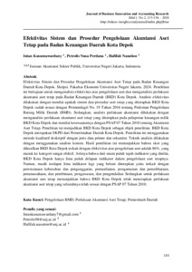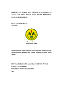Intan Kusumawardany. Efektivitas Sistem dan Prosedur Pengelolaan Akuntansi Aset Tetap pada Badan Keuangan Daerah Kota Depok. Skripsi. Fakultas Ekonomi Universitas Negeri Jakarta. 2024. Penelitian ini bertujuan untuk menganalisis efektivitas atas pengelolaan aset dan menganalisis perlakuan akuntansi aset tetap pada Badan Keuangan Daerah (BKD) Kota Depok. Analisis efektivitas dilakukan dengan menilai apakah sistem dan prosedur aset tetap yang diterapkan BKD Kota Depok sudah sesuai dengan Permendagri No. 19 Tahun 2016 tentang Pedoman Pengelolaan Barang Milik Daerah (BMD). Sedangkan, analisis perlakuan akuntansi dilakukan dengan menganalisis perlakuan akuntansi aset tetap yang diterapkan pada pelaporan keuangan milik BKD Kota Depok dan menilai kesesuaiannya dengan PSAP 07 Tahun 2010 tentang Akuntansi Aset Tetap. Penelitian ini menjadikan BKD Kota Depok sebagai objek penelitian. BKD Kota Depok merupakan SKPD dari Pemerintahan Daerah Kota Depok. Penelitian ini menggunakan metode kualitatif deskriptif dengan jenis data primer dan sekunder. Teknik analisis dilakukan dengan menggunakan analisis konten. Hasil penelitian ini menunjukkan bahwa skor yang dihasilkan BKD Kota Depok terkait dengan efektivitas atas pengelolaan aset adalah 86%, yang masuk ke kategori sangat efektif. Artinya bahwa dari enam puluh tujuh indikator yang dinilai, BKD Kota Depok hanya lima puluh delapan indikator dalam pengelolaan aset tetapnya telah menerapkan pengelolaan aset tetap berdasarkan Permendagri No. 19 Tahun 2016. Indikator tersebut yang belum diterapkan yaitu terkait dengan perencanaan kebutuhan dan penganggaran, pemanfaatan, pengamanan dan pemeliharaan, penatausahaan, dan pembinaan, pengawasan, dan pengendalian. Sedangkan untuk perlakuan akuntansi aset tetap menunjukkan bahwa BKD Kota Depok telah menerapkan perlakuan akuntansi aset tetap yang seluruhnya telah sesuai dengan PSAP 07 Tahun 2010. Penelitian ini mengharapkan BKD Kota Depok melakukan tindak lanjut atas tiga indikator pengelolaan aset yang belum sesuai dengan Permendagri No. 19 Tahun 2016 dan tetap mempertahankan kesesuaian perlakukan akuntansi yang diterapkan dengan PSAP 07 Tahun 2010 serta diharapkan terus memperbaharui kebijakan jika diperlukan nantinya. Kata Kunci : Pengelolaan Aset Tetap, Perlakuan Akuntansi Aset Tetap, Badan Keuangan Daerah Kota Depok