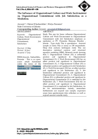 Penelitian ini bertujuan untuk mengetahui pengaruh budaya organisasi dan lingkungan kerja terhadap komitmen organisasi dengan kepuasan kerja sebagai mediasi pada karyawan PT. Dwimitra Ekatama Mandiri. Jenis penelitian ini adalah kuantitatif. Jumlah sampel dalam penelitian ini sebanyak 230 responden. Teknik analisis data dalam penelitian ini menggunakan analisis statistic deskriptif dan structural equation modeling (SEM). Adapun hasil penelitian menunjukkan bahwa Budaya Organisasi (X1) berpengaruh positif dan signifikan terhadap Komitmen Organisasi (Y), Lingkungan Kerja (X2) berpengaruh positif dan signifikan terhadap Komitmen Organisasi (Y), Budaya Organisasi (X1) berpengaruh positif dan signifikan terhadap Kepuasan Kerja (Z), Lingkungan Kerja (X2) berpengaruh positif dan signifikan terhadap Kepuasan Kerja (Z), Kepuasan Kerja (Z) berpengaruh positif dan signifikan terhadap Komitmen Organisasi (Y), Budaya Organisasi (X1) berpengaruh positif dan signifikan terhadap Komitmen Organisasi (Y) melalui Kepuasan Kerja (Z) dan Lingkungan Kerja (X2) tidak berpengaruh terhadap Komitmen Organisasi (Y) melalui Kepuasan Kerja (Z) pada PT. Dwimitra Ekatama Mandiri. Kata Kunci: Budaya Organisasi, Lingkungan Kerja, Komitmen Organisasi dan Kepuasan Kerja.