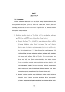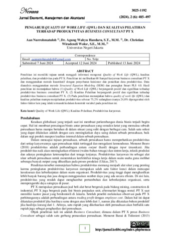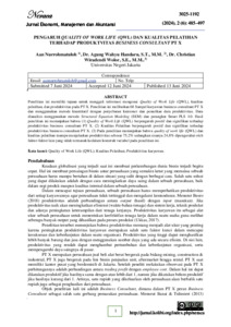 Aan Nurrohmatuloh, 2024: Pengaruh Quality of Work Life (QWL) dan Kualitas Pelatihan terhadap Produktivitas Business Consultant PT X. Skripsi, Jakarta: Konsentrasi Sumber Daya Manusia, Program Studi S1 Manajemen, Fakultas Ekonomi, Universitas Negeri Jakarta. Tim Pembimbing: Dr. Agung Wahyu Handaru, S.T., M.M. & Dr. Christian Wiradendi Wolor, S.E., M.M. Penelitian ini memiliki tujuan untuk menggali informasi mengenai Quality of Work Life (QWL), kualitas pelatihan, dan produktivitas pada PT X. Penelitian ini melibatkan 68 Sampel karyawan business consultant PT X dan menggunakan metode kuantitatif dengan penyebaran kuisioner dan penarikan data produktivitas. Data dianalisis menggunakan metode Structural Equation Modeling (SEM). Hasil penelitian ini menunjukan bahwa Quality of Work Life (QWL) berpengaruh positif dan signifikan terhadap produktivitas business consultant PT X. Kualitas Pelatihan berpengaruh positif dan signifikan terhadap produktivitas business consultant PT X. Pada penelitian menunjukan bahwa quality of work life (QWL) dan kualitas pelatihan mampu menjelaskan produktivitas sebesar 75,2% sedangkan sisanya 24,8% dipengerahui oleh faktor-faktor lain yang tidak termasuk kedalam konstruk variabel pada penelitian ini. Kata kunci: Quality of Work Life (QWL), Kualitas Pelatihan, Produktivitas karyawan.
