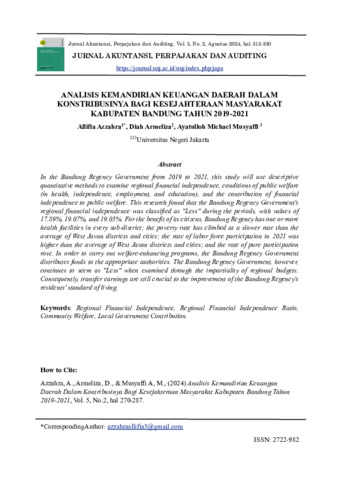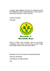 Allifia Azzahra. Analisis Kemandirian Keuangan dalam Konstribusinya Bagi Kesejahteraan Masyarakat Kabupaten Bandung Tahun 2019-2021. Fakultas Ekonomi, Universitas Negeri Jakarta, 2023. Penelitian ini bertujuan untuk menganalisis yaitu kemandirian keuangan daerah, kondisi kesejahteraan masyarakat (bidang kesehatan, kemandirian, ketenagakerjaan dan pendidikan) serta konstribusi kemandirian keuangan bagi kesejahteraan masyarakat pada Pemerintah Dearah Kabupaten Bandung 2019-2021 dengan menggunakan metode kuantitatif deskriptif. Hasil penelitian ini menunjukkan bahwa kemandirian keuangan daerah Pemkab Bandung dinilai “Kurang” dalam nilai 17,89%, 19,07%, 19,05% untuk periode tersebut. Kesejahteraan masyarakat Kabupaten Bandung memiliki satu bahkan lebih fasilitas kesehatan pada setiap kecamatan, presentase penduduk miskin mengalami kenaikan lebih rendah dibandingkan rata-rata kenaikan pada kabupaten/kota di Jawa Barat, Tingkat Partisipasi Angkatan Kerja tahun 2021 yang lebih besar dari rata-rata pada kabupaten/kota yang ada di Jawa Barat, Angka Partisipasi Murni yang berhasil meningkat. Pemkab Bandung mengalokasikan belanja pada dinas terkait untuk penyelenggaraan program yang bertujuan meningkatkan kesejahteraan. Akan tetapi jika ditinjau melalui kemandirian keuangan daerah Pemkab Bandung masih menunjukan “Kurang”. Maka perubahan positif yang ada pada kesejahteraan masyarakat Kabupaten Bandung masih bergantung pada pendapatan transfer. Kata Kunci: kemandirian keuangan daerah, rasio kemandirian keuangan daerah, kesejahteraan masyarakat, konstribusi pemerintah daerah.