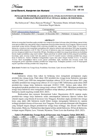 Indonesia selama lima tahun kebelakang selalu mengalami kenaikan angka produktivitas tenaga kerja, namun Indonesia selalu berada pada urutan kelima produktivitas tenaga kerja di negara Asia Tenggara dengan produktivitas jauh di bawah lima puluh ribu dolar AS. Padahal penduduk Indonesia memiliki jumlah yang besar dan tenaga kerjanya banyak namun tidak cukup mengimbangi atau bahkan mengungguli negara di kawasan Asia Tenggara lain yang memiliki jumlah penduduk lebih kecil. Penyebab utama produktivitas tenaga kerja yang rendah di Indonesia adalah rendahnya tingkat pendidikan. Berdasarkan data dari BPS, penduduk usia 15 tahun ke atas yang bekerja didominasi oleh lulusan SMA sederajat lalu SD, SMP, S1 ke atas dan D1-D3. Tingkat pendidikan yang rendah mencerminkan bahwa sumber daya manusia tidak lebih lama dalam menyelesaikan pendidikannya sehingga tidak banyak dan matang dalam memperoleh pengetahuan, informasi dan keahlian bekerja. Pengetahuan, informasi dan keahlian bekerja yang mumpuni akan dapat membantu tenaga kerja dalam dunia kerja guna menghasilkan hasil kerja yang lebih banyak dan akan mendorong kenaikan produktivitas. Berdasarkan data per provinsi di Indonesia, terdapat enam belas provinsi dengan produktivitas tenaga kerja di bawah seratus juta rupiah selama tujuh tahun sehingga provinsi tersebut tidak bisa menyumbang kenaikan angka produktivitas yang tinggi. Tujuan penelitian ini adalah untuk menganalisis pengaruh pendidikan, kesehatan, upah dan investasi modal fisik terhadap produktivitas tenaga kerja di Indonesia selama tahun 2016-2022. Penelitian ini juga menganalisis pengaruh pandemi covid- 19 (variabel dummy) terhadap produktivitas tenaga kerja. Metode yang digunakan pada penelitian ini adalah regresi data panel dengan software Eviews 12 versi pelajar. Hasil penelitian menunjukkan bahwa pendidikan, kesehatan, upah dan investasi modal fisik berpengaruh positif dan signifikan. Pandemi covid-19 berpengaruh negatif dan signifikan terhadap produktivitas tenaga kerja. Keseluruh variabel secara simultan berpengaruh terhadap produktivitas tenaga kerja. Penelitian selanjutnya dapat menambahkan jumlah wilayah penelitian dan meneliti sektor ekonomi tertentu guna mendapat hasil terperinci mengenai produktivitas tenaga kerja di Indonesia. Kata kunci: produktivitas tenaga kerja, pendidikan, kesehatan, upah, investasi modal fisik.