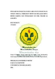 DIAN RAHAYU, 1707620014. Pengaruh Lingkungan Keluarga dan Lingkungan Teman Sebaya Terhadap Motivasi Belajar Siswa Bisnis Daring dan Pemasaran di SMK Negeri 44 Jakarta. Skripsi, Jakarta. Program Studi Pendidikan Bisnis, Fakultas Ekonomi, Universitas Negeri Jakarta. Penelitian ini bertujuan untuk mengetahui pengaruh lingkungan keluarga dan lingkungan teman sebaya terhadap motivasi belajar siswa program keahlian Bisnis Daring dan Pemasaran (BDP) di SMK Negeri 44 Jakarta. Metode penelitian ini menggunakan jenis penelitian deskriptif dengan pendekatan kuantitatif. Populasi yang digunakan adalah seluruh siswa program keahlian Bisnis Daring dan Pemasaran (BDP) tahun ajaran 2023/2024 yang terdiri dari 5 kelas dengan total 174 siswa. Sampel penelitian terdiri dari 121 siswa yang dipilih menggunakan teknik Propotional Random Sampling. Teknik analisis dalam penelitian menggunakan Asumsi Klasik, Koefisien Regresi Berganda, dan Koefisien Determinasi. Hasil penelitian menunjukan bahwa terdapat pengaruh positif dan signifikan antara lingkungan keluarga dengan motivasi belajar (p = 0,036; t = 2,126), terdapat pengaruh positif dan signifikan antara lingkungan teman sebaya dengan motivasi belajar (p = 0,001; t = 5,986), serta terdapat pengaruh positif dan signifikan antara lingkungan keluarga dan lingkungan teman sebaya dengan motivasi belajar secara bersama-sama atau simultan (p = 0,001; F = 36,347). Demikian lingkungan keluarga dan lingkungan teman sebaya dapat mempengaruhi motivasi belajar sebesar 38% dan sisanya dipengaruhi oleh faktor-faktor lain yang tidak diteliti sebesar 62%. Kata kunci: Motivasi Belajar, Lingkungan Keluarga, Lingkungan Teman Sebaya. .