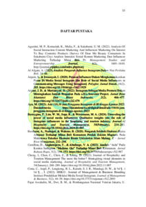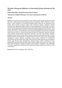 Penelitian ini bertujuan untuk menganalisis peran influencer dalam strategi pemasaran produk MS Glow melalui media sosial Instagram dengan pendekatan AIDA (Attention, Interest, Desire, Action). Influencer di Instagram dianggap sebagai salah satu alat pemasaran yang efektif dalam menarik perhatian audiens dan mendorong tindakan pembelian. Metode penelitian yang digunakan adalah kualitatif, dengan pengumpulan data melalui wawancara semi-terstruktur kepada sepuluh responden yang merupakan pengguna produk MS Glow. Hasil analisis menunjukkan bahwa influencer berhasil menciptakan perhatian melalui konten yang menarik dan relevan, serta membangun minat dengan menunjukkan keaslian dan transparansi dalam promosi. Selain itu, influencer juga berperan dalam meningkatkan keinginan konsumen untuk membeli produk dengan menyajikan informasi yang jelas dan menarik. Tindakan pembelian dipicu melalui tawaran khusus seperti kode promo yang disertakan dalam konten. Implikasi teoretis dari penelitian ini menunjukkan bahwa model AIDA tetap relevan dalam menganalisis strategi influencer marketing. Secara praktis, penelitian ini memberikan rekomendasi bagi perusahaan untuk lebih selektif dalam memilih influencer dan menciptakan konten yang inovatif untuk meningkatkan interaksi dengan audiens. Penelitian ini juga mengidentifikasi beberapa keterbatasan, seperti jumlah sampel yang terbatas dan fokus yang hanya pada Instagram, sehingga disarankan untuk penelitian selanjutnya agar melibatkan wawancara dengan pihak perusahaan dan memperluas lingkup penelitian ke platform media sosial lainnya. Kata kunci: Influencer, Instagram, AIDA, MS Glow