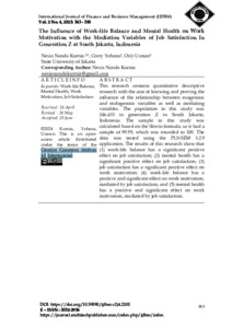 Penelitian ini mengandung penelitian deskriptif kuantitatif dengan tujuan untuk mengetahui dan membuktikan pengaruh hubungan variabel eksogen dan endogen serta variabel mediasi. Populasi dalam penelitian ini adalah 246.433 generasi Z di Jakarta Selatan, Indonesia. Sampel pada penelitian ini dihitung berdasarkan jumlah sampel terkecil yaitu 85 yang dibulatkan menjadi 100. Data yang diuji menggunakan aplikasi PLS-SEM 4.0 menunjukkan hasil penelitian bahwa (1) Work-life Balance berpengaruh positif signifikan tentang Kepuasan Kerja; (2) Kesehatan Mental berpengaruh positif signifikan terhadap Kepuasan Kerja; (3) Kepuasan Kerja berpengaruh positif signifikan terhadap Motivasi Kerja; (4) Worklife balance berpengaruh positif dan signifikan terhadap motivasi kerja yang dimediasi oleh kepuasan kerja; dan (5) Kesehatan Mental berpengaruh positif dan signifikan terhadap Motivasi Kerja yang dimediasi oleh Kepuasan Kerja. Kata Kunci: Motivasi Kerja, Work-life Balance, Mental Health, dan Kepuasan Kerja.