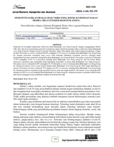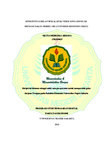 Silvia Meirizka Ardana, 2024: Efektivitas Iklan Bukalapak versi Song Joong Ki Menggunakan Metode Customer Response Index (CRI). Skripsi, Jakarta: Program Studi Sarjana Terapan Pemasaran Digital, Fakultas Ekonomi, Universitas Negeri Jakarta. Tim pembimbing: Dr. Christian Wiradendi Wolor S.E., M.M, dan Dewi Agustin Pratama Sari, S.E., M.M. Penelitian ini bertujuan untuk mengetahui efektivitas iklan Bukalapak versi Song Joong Ki menggunakan metode CRI. Sampel dan populasi dalam penelitian ini yaitu 120 responden dengan usia 17 – 40 tahun dan berdomisili di Jabodetabek dengan metode purposive sampling dan penyebaran kuesioner secara daring. Analisis data menggunakan analisis tabulasi sederhana dan metode Customer Response Index. Hasil penelitian penunjukkan bahwa nilai CRI yang dihasilkan iklan Bukalapak versi Song Joong Ki sebesar 25% dan dapat dikatakan kurang efektif. Kata Kunci: Customer Response Index (CRI), Efektivitas Iklan, Hierarchy of Effects, Komunikasi Pemasaran.