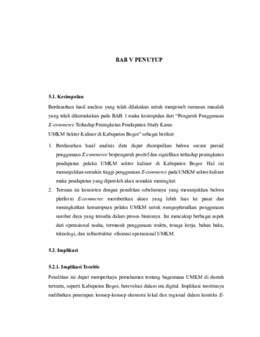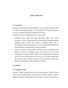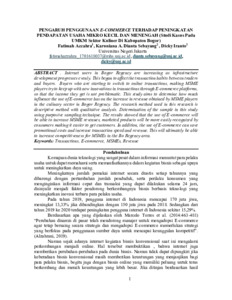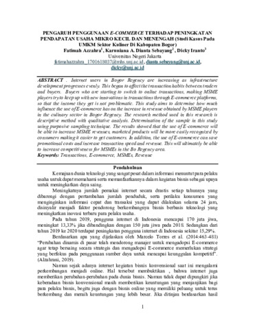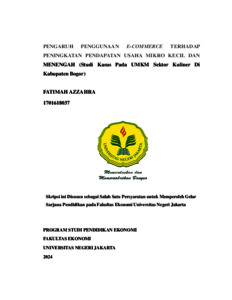 FATIMAH AZZAHRA, 1701618037. Pengaruh Penggunaan E-commerce Terhadap Peningkatan Pendapatan Usaha Mikro Kecil dan Menengah (Studi Kasus Pelaku UMKM Sektor Kuliner di Kabupaten Bogor). Skripsi. Program Studi Pendidikan Ekonomi, Fakultas Ekonomi, Universitas Negeri Jakarta. 2024. Pengguna internet di Kabupaten Bogor kian bertambah seiring majunya pembangunan infrastruktur yang merata. Hal ini mulai berpengaruh terhadap kebiasaan transaksi antara pedagang dan pembeli. Para pembeli yang mulai beralih bertransaksi secara daring, membuat para pelaku UMKM berusaha mengimbangi inovasi baru dalam bertransaksi melalui platform E-commerce, agar pendapatan yang mereka peroleh tidak bermasalah. Penelitian ini bertujuan untuk mengertahui seberapa besar pengaruh dari Penggunaan E-commerce terhadap Peningkatan Pendapatan yang diperoleh oleh para pelaku UMKM Sektor kuliner di Kabupaten Bogor. Metode penelitian yang digunakan dalam penelitian ini adalah metode deskriptif dengan analisis kualitatif. Penentuan sampel dalam penelitian ini menggunakan teknik purposive sampling. Hasil penelitian menunjukkan bahwa pemanfaatan E-commerce akan dapat meningkatkan pendapatan UMKM, produk yang dipasarkan akan lebih mudah dikenal oleh konsumen sehingga memudahkan dalam mendapatkan pelanggan. Selain itu, pemanfaatan E-commerce dapat menghemat biaya promosi dan meningkatkan kecepatan bertransaksi serta pendapatan. Hal ini pada akhirnya akan dapat meningkatkan daya saing bagi UMKM di wilayah Kabupaten Bogor, Jawa Barat. Kata Kunci: Transaksi, E-commerce, UMKM , Pendapatan