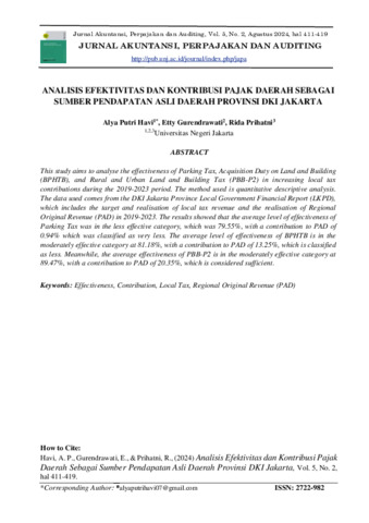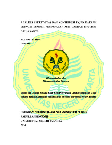HAVI, ALYA PUTRI (2024) ANALISIS EFEKTIVITAS DAN KONTRIBUSI PAJAK DAERAH SEBAGAI SUMBER PENDAPATAN ASLI DAERAH PROVINSI DKI JAKARTA. S1 thesis, Universitas Negeri Jakarta.