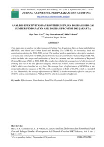 Penelitian ini bertujuan untuk menganalisis tingkat efektivitas tiga jenis pajak daerah di Provinsi DKI Jakarta yaitu Pajak Parkir, Bea Perolehan Hak Atas Tanah dan Bangunan (BPHTB), dan Pajak Bumi dan Bangunan Pedesaan dan Perkotaan (PBBP2) dalam meningkatkan kontribusi pajak daerah periode tahun 2019-2023. Penelitian ini menggunakan metode analisis deskriptif kuantitatif. Objek dalam penelitian ini adalah pajak daerah sebagai sumber Pendapatan Asli Daerah. Data yang digunakan bersumber dari Laporan Keuangan Pemerintah Daerah Provinsi DKI Jakarta berupa target dan realisasi penerimaan pajak daerah tahun 2019-2023, dan realisasi Pendapatan Asli Daerah tahun 2019-2023. Analisis data yang dilakukan adalah menghitung tingkat efektivitas dan kontribusi Pajak Parkir, BPHTB, dan PBB-P2, kemudian menganalisis dari perhitungan yang ada untuk mengetahui faktor-faktor yang mempengaruhi perkembangan pajak daerah setiap tahunnya. Hasil penelitian ini menunjukkan bahwa rata-rata tingkat efektivitas Pajak Parkir masih dalam kriteria kurang efektif sebesar 79,55% dan kontribusi Pajak Parkir terhadap PAD sebesar 0,94% dalam kriteria sangat kurang. Kemudian, rata-rata tingkat efektivitas BPHTB yaitu dalam kriteria cukup efektif sebesar 81,18% dan kontribusi BPHTB terhadap PAD sebesar 13,25% dalam kriteria kurang. Dan rata-rata tingkat efektivitas PBB-P2 yaitu dalam kriteria cukup efektif sebesar 89,47% dan kontribusi PBB-P2 terhadap PAD sebesar 20,35% dalam kriteria sedang. Rekomendasi bagi peneliti selanjutnya yaitu untuk dapat melakukan analisis pada sumber PAD yang lainnya, dan dapat melakukan penelitian dengan periode waktu yang lebih panjang. Kata Kunci: efektivitas, kontribusi, pajak daerah, pendapatan asli daerah
