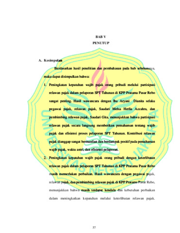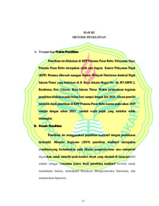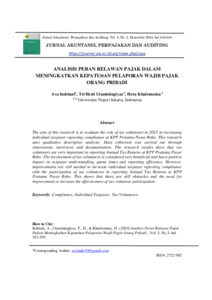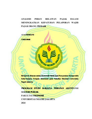 ndriani, Ava.2024.Analisis Peran Relawan Pajak Dalam Meningkatkan KepatuhanPelaporan Wajib Pajak OrangPribadi. Program Studi: D-IV Akuntansi Sektor Publik Universitas Negeri Jakarta. PembimbingI:Tri Hesti Utaminingtyas, SE., M.SA;PembimbingII:Hera Khairunnisa,SE., M.Ak Penelitian ini bertujuan untuk menganalisis peranrelawan pajak tahun 2023 dalam meningkatkan kepatuhan pelaporan wajib pajak orangpribadi pada KPP Pratama Pasar Rebo. Metodepenelitian yangdigunakan pada penelitian ini adalahanalisis kualitatif deskriptif. Pemilihan desain pada penelitian ini yaituuntuk mengungkap peristiwa dan fakta-fakta yang relevan dengan judul penelitian, sehingga penulis dapat merepresentasikan data yangtelahdikumpulkan mengenai peran relawan pajak dalam meningkatkan kepatuhan pelaporan wpop padaKPP PratamaPasar Rebo.Penelitian ini menjadikan KPP Pratama Pasar Rebo sebagai objek penelitian. Teknik analisis yangdigunakan dalam penelitian ini berupa teknik analisis kualitatif.Teknik pengumpulan data dilakukan dengan menggunakan teknik observasi, wawancara dan dokumentasi.Hasil Penelitianmenunjukkanketerlibatan relawan pajak dalam pelaporan SPT Tahunan di KPP Pratama Pasar Rebomemiliki peran yang sangat penting dalam meningkatkan kepatuhan wajib pajak orang pibadi. Keterlibatan relawan pajak sangat membantu danberdampak positif pada pemahaman wajib pajak, mempersingkat waktu antri, dan meningkatkan efisiensi pelaporan.Sebagaimana berdasarkan dokumentasi dan wawancara yang dilakukan peneliti kepada Staff PenyuluhPajak, Relawan Pajakdari Uhamka dan PembimbingRelawan Pajakmenunjukkan bawa pelayanan yangdiberikan relawan pajak dapat mengarahkan kepatuan wpop dalam pelaporan SPT Taunan,hal ini ditujukan dengan melihat target dan realisasi kinerja kepatuhan wpop dari taun 2019-2023 selalu mencapai target yang ditetapkan dari Direktorat Jenderal Pajak, meskipunfluktuatif.Namun peningkatan wajib pajak orang pribadi dengan keterlibatan relawan pajak dalam pelaporan SPT Tahunan di KPP Pratama Pasar Rebomasih memerlukan perbaikan. Hal ini menunjukkan bahwa masih terdapat kendala dan kebutuhan perbaikan dalam meningkatkan efektivitas keterlibatan relawan pajak. Sosialisasi yang belum optimal, kurangnya pengembangan keterampilan relawan pajak, serta aspekkualitas pelayanan masih perlu ditingkatkan. Kata Kunci :Relawan Pajak, Wajib Pajak Orang Pribadi, Kepatuhan