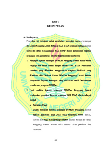 EKO ANGGOROJATI RAMADHAN. USULAN PENERAPAN SAK ETAP PADA LAPORAN KEUANGAN BUMDES PANGGUNG LESTARI DESA PANGGUNGHARJO. Skripsi, Fakultas Ekonomi, Universitas Negeri Jakarta, 2023. Penelitian ini dilakukan bertujuan untuk memberikan usulan penerapan SAK ETAP terhadap laporan keuangan BUMDes Panggung Lestari dan menganalisis laporan keuangan BUMDes Panggung Lestari yang telah disusun. Penelitian ini menggunakan pendekatan kualitatif dengan jenis penelitiannya yaitu deskriptif. Penelitian ini menggunakan data primer dan data sekunder. Data primer yang digunakan merupakan hasil wawancara dengan pelaksana BUMDes, sedangkan data sekunder berupa laporan keuangan BUMDes. Berdasarkan hasil penelitian yang telah dilakukan dapat disimpulkan bahwa: 1. Penyajian laporan keuangan BUMDes Panggung Lestari masih terdapat kesalahan dalam pencatatan akun seperti pembelian persediaan dan perlengkapan yang langsung dibebankan, penyajian laporan keuangan BUMDes Panggung Lestari belum menyajikan komponen laporan keuangan secara lengkap. 2. BUMDes Panggung Lestari diharapkan dapat mengimplementasikan SAK ETAP terhadap penyajian laporan keuangannya guna untuk meningkatkan kualitas laporan keuangan. Kata Kunci: Laporan Keuangan, SAK ETAP, BUMDes, Penyajian, Tampilan
