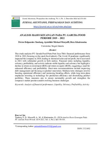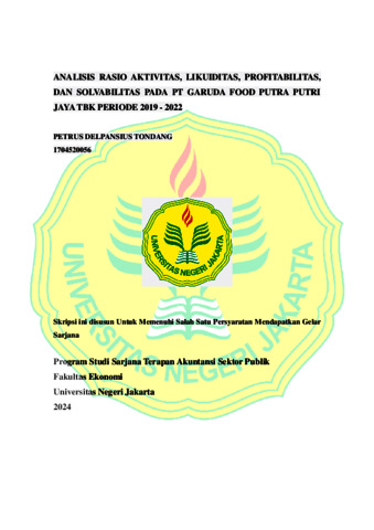 TONDANG, PETRUS DELPANSIUS (2024) ANALISIS RASIO AKTIVITAS, LIKUIDITAS, PROFITABILITAS, DAN SOLVABILITAS PADA PT GARUDA FOOD PUTRA PUTRI JAYA TBK PERIODE 2019 - 2022. S1 thesis, Universitas Negeri Jakarta.