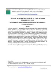 Penelitian ini bertujuan untuk melakukan analisis kinerja keuangan PT. Garuda Food Putra Putri Jaya Tbk, sebuah perusahaan di sektor industri makanan ringan, selama periode tahun 2019 hingga 2022. Pandemi Covid-19 memiliki dampak signifikan pada kinerja keuangan perusahaan, dengan terjadi penurunan penjualan dan laba bersih pada tahun 2020. Namun, perusahaan berhasil pulih pada tahun 2021 dengan pertumbuhan yang drastis dalam penjualan dan laba bersih. Analisis kinerja keuangan dilakukan dengan menggunakan rasio keuangan seperti likuiditas, solvabilitas, profitabilitas, dan aktivitas. Hasil analisis menunjukkan bahwa perusahaan memiliki stabilitas dalam rasio likuiditas dan solvabilitas, namun perlu diperhatikan penurunanreturn on investment (ROI)danreturn on equity (ROE)untuk meningkatkan efisiensi penggunaan ekuitas dan profitabilitas perusahaan. Saran untuk perusahaan dalam jangka pendek adalah untuk terus meningkatkan pengawasan pengelolaan utang dan fokus pada inovasi produk.Dalam jangka menengah, perusahaan harus memperkuat efisiensi operasional dan meningkatkan upaya branding dan pemasaran. Sedangkan dalam jangka panjang,perusahaan harus menginvestasikan dalam teknologi dan sistem informasi untuk meningkatkan efisiensi proses produksi dan manajemen, serta melakukan diversifikasi portofolio produk. Penelitian ini bertujuan memberikan saran yang berguna bagi PT.Garuda Food Putra Putri Jaya Tbk dalam menghadapi tantangan dan peluang di pasar makanan ringan. Dengan mengambil langkah-langkah strategis yang tepat, perusahaan dapat mencapai pertumbuhan yang berkelanjutan dan memperkuat posisinya di industri.Selain itu, penerapan teknologi dan analisis data dalam bidang keuangan dapat menjadi kunci kesuksesan perusahaan dalam menghadapi perubahan lingkungan bisnis yang cepat dan kompleks. Kata Kunci: Analisis kinerja keuangan, Likuiditas, Solvabilitas, Profitabilitas, Aktivitas
