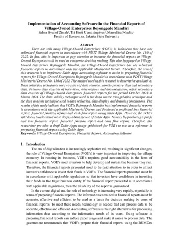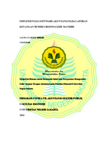 SALWA SYARIEF ZIMAH. 2024. 1704520004. Implementasi Software Akuntansi pada Laporan Keuangan BUMDes Bojonggede Mandiri. Program Studi Akuntansi Sektor Publik, Fakultas Ekonomi, Universitas Negeri Jakarta. Masih terdapat banyak Badan Usaha Milik Desa (BUMDes) di Indonesia yang belum menyampaikan laporan keuangan sesuai dengan Keputusan Menteri Desa PDTT No. 136 Tahun 2022. Padahal hal tersebut penting untuk diperhatikan karena laporan keuangan pada BUMDes akan dijadikan sebagai pengambilan keputusan ekonomi. Hal ini yang juga terjadi pada BUMDes Bojonggede Mandiri, BUMDes tersebut belum menyampaikan laporan keuangan sesuai dengan Keputusan Menteri yang berlaku. Oleh karena itu, tujuan dilakukan penelitian ini adalah untuk mengimplementasikan software akuntansi Zahir Apps dalam membantu penyusunan laporan keuangan pada BUMDes Bojonggede Mandiri sesuai dengan Keputusan Menteri Desa PDTT No. 136 Tahun 2022. Metode yang digunakan dalam penelitian ini adalah deskriptif kualitatif. Teknik pengumpulan data menggunakan dua jenis sumber data yaitu data primer dan data sekunder. Data primer terdiri atas wawancara, observasi, dan dokumentasi, sedangkan data sekunder terdiri atas laporan keuangan BUMDes periode bulan oktober 2023 sampai dengan maret 2024. Teknik keabsahan data yang digunakan ialah teknik triangulasi sumber data dan Teknik analisis data yang digunakan adalah reduksi data, tampilan data, dan pengambilan kesimpulan. Hasil penelitian ini menunjukkan bahwa BUMDes Bojonggede Mandiri sudah menerapkan laporan keuangan sesuai keputusan Menteri yang berlaku dan menghasilkan laporan keuangan laba rugi, laporan posisi keuangan dan laporan arus kas dengan menggunakan Zahir Apps. Namun, BUMDes tersebut masih belum mengerti lebih dalam terkait penggunaan Zahir Apps. yaitu dengan menghasilkan laporan keuangan laba rugi, laporan posisi keuangan dan laporan arus kas. Oleh karena itu, peneliti memberikan rancangan buku panduan penggunaan Zahir Apps untuk digunakan BUMDes sebagai acuan dalam penyusunan laporan keuangan menggunakan Zahir Apps. Kata Kunci: BUMDes; Laporan Keuangan; Software Akuntansi