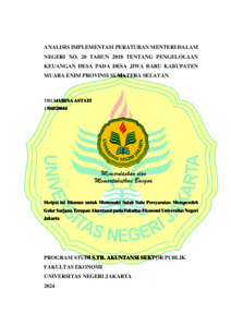 TRI MARINA ASTATI. Analisis Implementasi Peraturan Menteri Dalam Negeri No. 20 Tahun 2018 Tentang Pengelolaan Keuangan Desa Pada Desa Jiwa Baru Kabupaten Muara Enim Provinsi Sumatera Selatan. Skripsi. Jakarta: Fakultas Ekonomi, Universitas Negeri Jakarta, 2024. Penelitian ini bertujuan untuk menganalisis implementasi Peraturan Menteri Dalam Negeri No. 20 Tahun 2018 serta kendala yang dihadapi dan strategi yang telah diterapkan. Objek penelitian ini adalah Desa Jiwa Baru. Menggunakan jenis penelitian kualitatif dan pendekatan studi kasus lapangan dan menggunakan data primer dan sekunder. Berdasarkan hasil analisis yang telah dilakukan dapat disimpulkan bahwa Peraturan Menteri Dalam Negeri No. 20 Tahun 2018 Tentang Pengelolaan Keuangan, secara garis besar telah diimplementasikan dengan baik. Namun masih terdapat beberapa aspek yang belum maksimal, yaitu bagian transparan belum mempunyai website, bagian akuntabel belum terdapat alamat pengaduan, bagian partisipatif belum terdapat swadaya dari masyarakat desa, bagian pendapatan belum memiliki PAD dari swadaya masyarakat desa dan belum mendapat bantuan dari APBD Provinsi dan Kabupaten, bagian belanja belum membuat anggaran belanja tak terduga, bagian pembiayaan belum membuat dana cadangan, bagian pelaksanaan belum membuat RKAD serta RKKD dan bagian penatausahaan belum membuat buku pembantu panjar. Kendala yang dihadapi yaitu pemerintah desa masih kurang berkoordinasi, kurangnya kesadaran, kurangnya pengetahuan dan keterampilan, kurangnya kesadaran terhadap pentingnya pembuatan DPA, kurangnya partisipatif masyarakat desa, keterbatasan media informasi online dan keterbatasan finansial masyarakat desa. Strategi yang telah diterapkan yaitu meningkatkan kerjasama, memberikan penjelasan yang mudah dimengerti, membuat program kerja yang bisa menjadi prioritas, meningkatkan pengetahuan dan kemampuan. Kata Kunci: APB Desa, Asas Pengelolaan, Kekuasaan Pengelolaan, Pembinaan dan Pengawasan, Pengelolaan
