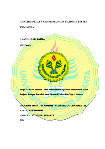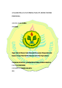 AMANDA JULIA ZAHRA, 2024: ANALISIS PELAYANAN PRIMA PADA PT HOME TESTER INDONESIA. PROGRAM STUDI D4 ADMINISTRASI PERKANTORAN DIGIRAL, FAKULTAS EKONOMI, UNIVERSITAS NEGERI JAKARTA Penelitian ini bertujuan untuk menganalisis penerapan pelayanan prima pada PT Home Tester Indonesia menggunakan pendekatan deskriptif kualitatif. Dalam persaingan bisnis yang semakin ketat, pelayanan prima menjadi faktor penentu keberhasilan perusahaan dalam mempertahankan dan menarik pelanggan. PT Home Tester Indonesia, sebagai perusahaan yang bergerak dalam riset dan pengujian produk konsumen, sangat mengandalkan pelayanan berkualitas tinggi untuk mempertahankan serta menarik pelanggan baru. Fokus penelitian ini adalah mengidentifikasi komponen-komponen kunci dari pelayanan prima dan mengevaluasi bagaimana penerapannya dapat meningkatkan kepuasan pelanggan. Metode penelitian deskriptif kualitatif digunakan untuk menggali lebih dalam tentang pelayanan prima yang diberikan karyawan kepada pelanggan PT Home Tester Indonesia. Data diperoleh melalui wawancara mendalam dengan 5 karyawan PT Home Tester Indonesia. Selain itu, observasi partisipan dan analisis dokumen perusahaan juga digunakan sebagai metode pengumpulan data. Hasil penelitian menunjukkan bahwa dimensi-dimensi pelayanan prima seperti sikap, kemampuan, perhatian, tindakan, tanggung jawab, penampilan, simpati, memiliki pengaruh yang signifikan terhadap kepuasan pelanggan. Kehandalan dan responsivitas merupakan dimensi yang paling dominan mempengaruhi kepuasan pelanggan. Pelanggan merasa puas ketika perusahaan mampu memberikan pelayanan yang tepat waktu dan sesuai dengan yang dijanjikan. Selain itu, sikap responsif dan kemampuan karyawan dalam menangani keluhan serta memberikan solusi cepat juga menjadi faktor penting dalam menciptakan kepuasan pelanggan. Penelitian ini menyimpulkan bahwa PT Home Tester Indonesia telah menerapkan sebagian besar aspek pelayanan prima dengan baik, namun masih ada ruang untuk peningkatan, terutama dalam hal peningkatan komunikasi antara pelanggan dan perusahaan. Rekomendasi yang diajukan mencakup peningkatan pelatihan karyawan, peningkatan sistem umpan balik pelanggan, dan pengembangan strategi komunikasi yang lebih efektif untuk memastikan kepuasan pelanggan yang lebih tinggi di masa mendatang. Kata kunci: Pelayanan prima, kepuasan pelanggan, karyawan