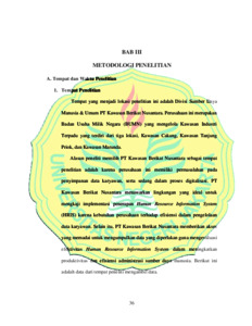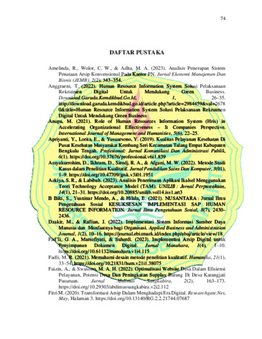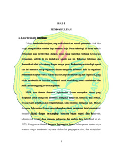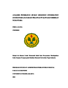 FIRDA AZANIA. 2024. 1703520018. Analisis Penerapan Human Resource Information System Pada Database Pegawai PT Kawasan Berikat Nusantara. Program Studi Diploma 4 Administrasi Perkantoran Digital. Fakultas Ekonomi. Universitas Negeri Jakarta. Penelitian ini dilakukan pada Divisi Sumber Daya Manusia dan Umum PT Kawasan Berikat Nusantara. Tujuan dari penelitian ini adalah untuk mengevaluasi penerapan Human Resource Information System (HRIS) sebagai proses digitalisasi penyimpanan data karyawan, serta menganalisis peran Human Resource Information System (HRIS) pada dalam pengelolaan data dan informasi karyawan di lingkungan perusahaan. Penelitian ini menggunakan metode kualitatif, dengan mengumpulkan data melalui sumber primer dan sekunder. Data primer diperoleh melalui wawancara, observasi, dan dokumentasi, sementara data sekunder diperoleh melalui buku, jurnal, atau artikel yang membahas penerapan Human Resource Information System (HRIS) di perusahaan. Penelitian ini dianalisis menggunakan metode deskriptif, dengan teknik analisis data berdasarkan teori Miles dan Huberman yang mencakup reduksi data, penyajian data, dan penarikan kesimpulan. Hasil penelitian ini menunjukkan bahwa penerapan Human Resource Information System (HRIS) pada PT Kawasan Berikat Nusantara sangat membantu sumber daya manusia dalam mengumpulkan, mengelola dan mengupdate data karyawan. Sumber daya manusia juga mudah dalam menemukan data atau informasi yang dibutuhkan, sehingga dapat meningkatkan efisiensi. Diharapkan dengan penelitian ini akan memberikan informasi mengenai penerapan Human Resource Information System (HRIS) di PT Kawasan Berikat Nusantara. Rekomendasi yang dapat diberikan ialah melakukan pelatihan intensif mengenai penggunaan Human Resource Information System (HRIS), melakukan evaluasi rutin, melakukan peningkatan dan pengembangan fitur yang memudahkan karyawan dalam menemukan informasi. Kata Kunci: Database Pegawai, Digitalisasi, Human Resource Information System