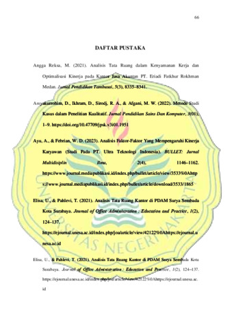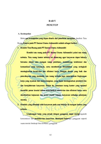 INDRIANI PUTRI. 2024. 1703520046. Analisis Tata Ruang pada PT Sarana Utama Adimandiri. Program studi Diploma 4 Administrasi Perkantoran Digital. Fakultas Ekonomi. Universitas Negeri Jakata. Penelitian ini bertujuan untuk mengidentifikasi dan menganalisis faktor-faktor yang mempengaruhi penataan ruang pada PT. Sarana Utama Adimandiri Serta untuk mengetahui kendala dan solusi atas kendala yang terjadi pada kantor tata ruang. Jenis penelitian yang digunakan adalah penelitian kualitatif. Metode pengumpulan data adalah studi literatur, observasi, wawancara dan dokumentasi. Metode pengolahan data menggunakan pengumpulan data, reduksi data dan penyajian data serta penarikan kesimpulan data. Hasil dari penelitian ini menyatakan kondisi tata ruang pada PT Sarana Utama Adimandiri yakni tata ruang terbuka. Tata ruang kantor terbuka ini dirancang agar karyawan dapat bekerja bersama dalam satu ruangan tanpa pembatas, mendukung kolaborasi dan komunikasi antar karyawan, serta memberikan fleksibilitas yang seringkali meningkatkan kreativitas dan efisiensi kerja. Kondisi tata ruang terbuka tentunya memiliki kendala yang tidak dapat dihindari yang menyebabkan karyawan tidak selalu bekerja dengan efisien. Kendala yang muncul akibat tata ruang kantor terbuka menunjukkan bahwa meskipun terdapat berbagai tantangan, karyawan mampu menemukan sousi efektif untuk bekerja dengan nyaman dan produktif serta perusahaan juga berupaya untuk memaksimalkan tata kelola ruang kerja agar karyawan selalu merasa nyaman. Kata Kunci: Tata Ruang Kantor, Kenyamanan