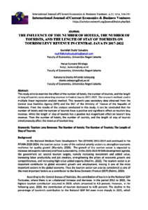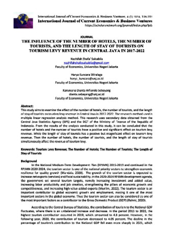 NAZHIFAH SHAFA’ SALSABILA. Pengaruh Jumlah Hotel, Jumlah Wisatawan, dan Lama Tinggal Wisatawan Terhadap Pendapatan Retribusi Pariwisata di Jawa Tengah Tahun 2017 – 2022. Skripsi. Jakarta. Program Studi Pendidikan Ekonomi. Fakultas Ekonomi. Universitas Negeri Jakarta. 2024. Penelitian ini bertujuan untuk mengetahui pengaruh jumlah hotel, jumlah wisatawan, dan lama tinggal wisatawan terhadap pendapatan retribusi pariwisata di Jawa Tengah tahun 2017 hingga 2022. Metode analisis yang digunakan adalah kuantitatif, dengan teknik analisis regresi linier berganda dan diolah menggunakan software Eviews 12. Data yang digunakan dalam penelitian ini diperoleh sekunder dari Badan Pusat Statistika Jawa Tengah dan DJPK Kementerian Keuangan Republik Indonesia. Hasil penelitian ini menunjukkan bahwa variabel jumlah hotel memiliki pengaruh positif signifikan terhadap pendapatan retribusi pariwisata, variabel jumlah wisatawan memiliki pengaruh positif signifikan terhadap pendapatan retribusi pariwisata, dan variabel lama tinggal wisatawan berpengaruh positif namun tidak signifikan terhadap pendapatan retribusi pariwisata. Kata Kunci : Jumlah Hotel, Jumlah Wisatawan, Lama Tinggal Wisatawan, dan Pendapatan Retribusi Pariwisata