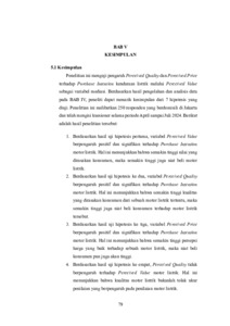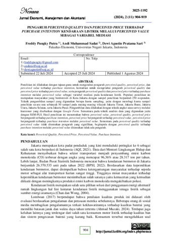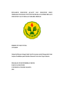 Freddy Pungky Putra 1707618059 Pengaruh Perceived Quality dan Perceived Price Terhadap Purchase Intention Kendaraan Listrik melalui Perceived Value sebagai Variabel Mediasi Penelitian ini dilakukan dengan tujuan guna untuk mengetahui pengaruh perceived quality, perceived price, dan perceived value terhadap purchase intention, kemudian untuk mengetahui pengaruh perceived quality dan perceived price terhadap perceived value, serta pengaruh perceived quality dan perceived price terhadap purchase intention melalui perceived value sebagai variabel mediasi pada kendaraan listrik. Populasi penelitian ini merupakan masyarakat yang berdomisili di Kota Jakarta dengan sampel penelitian berjumlah 250 responden. Teknik pengambilan sampel yang digunakan berupa kuota sampling, yaitu dengan membagi kuota sampel penelitian secara rata sebanyak 50 sampel pada masing-masing wilayah Jakarta Timur, Jakarta Barat, Jakarta Utara, Jakarta Selatan, serta Jakarta Pusat. Pengambilan data dilakukan dengan teknik angket atau survey melalui kuesioner yang disebarkan dengan Google Form. Sementara pada teknik analisis data yang digunakan yaitu dengan SEM-PLS. Hasil penelitian ini menemukan bahwa perceived value, perceived quality, perceived price berpengaruh terhadap purchase intention, perceived price berpengaruh terhadap perceived value, perceived price berpengaruh terhadap purchase intention melalui perceived value. Sementara pada perceived quality terhadap perceived value tidak ditemukan pengaruh yang signifikan, begitupula dengan perceived quality terhadap purchase intention melalui perceived value ditemukan tidak ada pengaruh. Kata kunci: Perceived Quality, Perceived Price, Perceived Value, Purchase Intention.