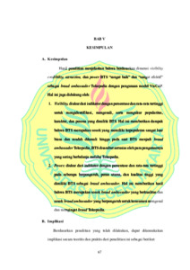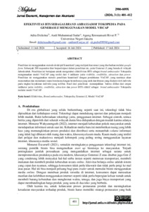ABSTRAK Adita Dzikrina, 2024; Efektivitas BTS Sebagai Brand Ambassador Tokopedia Pada Generasi Z Menggunakan Model VisCAP. Skripsi, Jakarta: Program Studi D4 Pemasaran Digital, Fakultas Ekonomi, Universitas Negeri Jakarta. Tim pembimbing: Andi Muhammad Sadat, SE., M.Si., Ph.D dan Agung Kresnamurti Rivai P., ST, M.M. Penelitian ini menggunakan metode deskriptif kuantitatif yang meliputi kuesioner yang disebarkan melalui google form. Sebanyak 200 responden ikut berpartisipasi dalam penelitian ini, yaitu Generasi Z yang berada di wilayah Jabodetabek. Penelitian ini bertujuan untuk mengetahui efektifivitas BTS sebagai brand ambassador Tokopedia mengunaakan model VisCAP yang terdiri dari 4 dimensi yaitu visibility, credibility, attraction dan power. Penelitian ini menggunakan metode penelitian kuantitatif dengan pendekatan VisCAP, yang akan menemukan dan memahami suatu fenomena dengan konteksnya yang unik dan khusus yang dialami oleh individu pada tingkat keyakinan individu yang terlibat. Hasil dari penelitian menunjukkan bahwa dilihat dari empat dimensi yaitu visibility, credibility, attraction dan power BTS efektif sebagai brand ambassador Tokopedia melalui model VisCAP. Terdapat beberapa pernyataan tidak efektif yang berhubungan dengan kualitas, karna itu BTS dapat meningkatkan kualitas yang dimiliki sehingga dapat meningkatkan efektitivas sebagai brand ambassador. Kata kunci: Efektivitas, Brand Ambassador, Tokopedia, Generasi Z, Model VisCAP