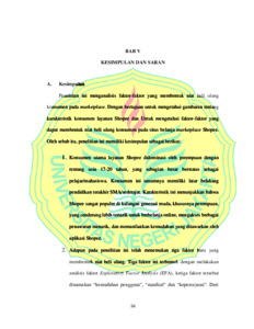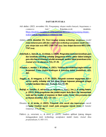 ABSTRAK Dani Syairul Alim, 2024; Analisis Faktor-Faktor Yang Membentuk Niat Beli Ulang Konsumen Pada Marketplace. Skripsi, Jakarta: Program Studi D4 Pemasaran Digital, Fakultas Ekonomi, Universitas Negeri Jakarta Penelitian ini bertujuan untuk menganalisis faktor-faktor yang membentuk niat beli ulang konsumen pada marketplace Shopee dengan menggunakan pendekatan Technology Acceptance Model (TAM). Dalam model ini, tiga dimensi utama yang dianalisis adalah Perceived Usefulness (PU), Perceived Ease of Use (PEOU) dan kepercayaan (trust). Penelitian dilakukan dengan metode kuantitatif menggunakan kuesioner yang disebarkan kepada 130 responden yang merupakan pengguna aktif aplikasi Shopee di Kota Bekasi. Hasil penelitian menunjukkan bahwa mayoritas responden adalah perempuan berusia 17-20 tahun yang sebagian besar berstatus sebagai pelajar atau mahasiswa. Berdasarkan analisis faktor eksploratori (Exploratory Factor Analysis), penelitian ini berhasil mengidentifikasi tiga faktor utama yang berkontribusi terhadap niat beli ulang konsumen, yaitu kemudahan penggunaan aplikasi, manfaat yang diperoleh dari aplikasi, dan tingkat kepercayaan konsumen terhadap Shopee. Dari ketiga faktor tersebut, kemudahan penggunaan aplikasi dan manfaat yang diperoleh terbukti menjadi faktor yang paling berpengaruh dalam meningkatkan niat beli ulang konsumen. Penelitian ini memberikan kontribusi teoretis dengan mengkonfirmasi relevansi model TAM dalam konteks pembelian online di Indonesia, serta memberikan wawasan praktis bagi Shopee dalam mengembangkan strategi pemasaran yang lebih efektif dengan fokus pada peningkatan kemudahan penggunaan dan manfaat aplikasi. Selain itu, peningkatan pada aspek kepercayaan konsumen juga diidentifikasi sebagai area yang perlu mendapatkan perhatian lebih untuk mempertahankan loyalitas pengguna. Kata kunci: Niat Beli Ulang, Marketplace, Shopee, Technology Acceptance Model (TAM), Perceived Usefulness, Perceived Ease of Use dan kepercayaan (trust)