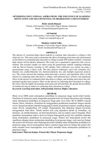 Rizki Amelia Rinjani 1709620092. Pengaruh Motivasi Belajar Dan Potensi Diri Terhadap Minat Siswa Melanjutkan Pendidikan Ke Perguruan Tinggi Pada SMKN Di Jakarta Timur. Skripsi Jakarta: Faklutas Ekonomi, Universitas Negeri Jakarta 2024. Minat siswa SMK untuk melanjutkan pendidikan ke perguruan tinggi masih relatif rendah. Penelitian ini bertujuan untuk mengetahui pengaruh motivasi belajar dan potensi diri terhadap minat melanjutkan pendidikan ke perguruan tinggi pada siswa kelas XII di SMKN 51 Jakarta, SMKN 10 Jakarta, dan SMKN 48 Jakarta. Penelitian ini menggunakan pendekatan kuantitatif dengan metode survei. Sampel penelitian diambil menggunakan teknik proportional random sampling dengan rumus Slovin, menghasilkan 105 sampel. Pengumpulan data dilakukan dengan kuesioner menggunakan skala likert. Teknik analisis data yang digunakan adalah analisiss statistik deskriptif, uji normalitas, uji reliabilitas, uji multikolinearitas, uji heteroskedastisitas, uji analisis regresi berganda, uji f, uji t, dan uji koefisien determinasi. Hasil penelitian menunjukkan bahwa: motivasi belajar berpengaruh positif dan signifikan terhadap minat melanjutkan pendidikan ke perguruan tinggi yang menunjukkan bahwa semakin tinggi motivasi belajar maka semakin kuat pula dorongan siswa untuk melanjutkan pendidikan ke perguruan tinggi. Potensi diri berpengaruh positif dan signifikan terhadap minat melanjutkan pendidikan ke perguruan tinggi, semakin berkembangnya potensi diri siswa maka semakin tinggi pula minat siswa untuk melanjutkan pendidikan ke perguruan tinggi. Serta motivasi belajar dan potensi diri bersama-sama berpengaruh positif terhadap minat melanjutkan pendidikan ke perguruan tinggi, hal ini menunjukkan bahwa semakin tinggi motivasi belajar dan potensi diri maka semakin besar kemungkinan siswa untuk memiliki minat melanjutkan pendidikan ke perguruan tinggi. Kata kunci: Motivasi Belajar, Potensi Diri, Minat, Perguruan Tinggi