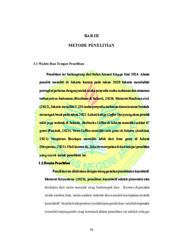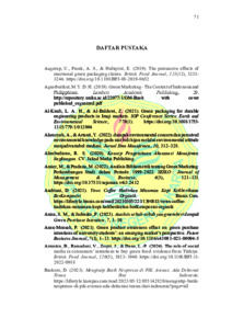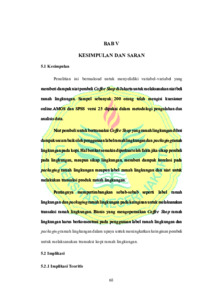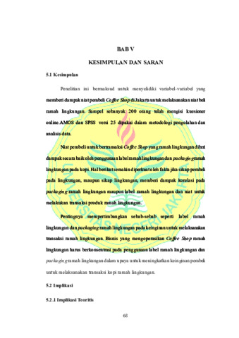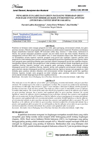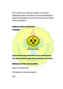 ABSTRAK Farrah Ladiva Kurniawan: Pengaruh Eco-Label dan Green Packaging terhadap Green Purchase Intention Dimediasi oleh Environmental Attitude (Studi pada Coffee Shop di Jakarta). Skripsi, Jakarta: Program Studi S1 Manajemen, Fakultas Ekonomi, Universitas Negeri Jakarta, Tim Pembimbing: Dr. Setyo Ferry Wibowo, S.E., M.Si. dan Ika Febrilia, S.E., M.M. Penelitian berikut menyelidiki pengaruh kemasan ramah lingkungan, label ramah lingkungan, persepsi tentang lingkungan, dan keinginan untuk melakukan pembelian ramah lingkungan. Penelitian ini menggunakan pendekatan kuantitatif. Penelitian ini melibatkan penyebaran kuesioner kepada 200 orang di Jakarta yang berusia minimal 17 tahun dan telah melakukan setidaknya satu kali pembelian dalam tiga bulan terakhir. Analisis data penelitian ini dilakukan dengan menggunakan AMOS dan SPSS versi 25. Setiap teori memiliki dampak yang signifikan dan bermanfaat, menurut hasil penelitian. Hipotesis pertama diterima, yang menyatakan bahwa label ramah lingkungan memiliki dampak positif dan cukup besar terhadap keinginan pembeli untuk melakukan pembelian ramah lingkungan. Hipotesis kedua diterima, yang menyatakan bahwa kemasan ramah lingkungan memiliki dampak positif dan signifikan terhadap keinginan pembeli untuk melakukan pembelian ramah lingkungan. Hipotesis ketiga, yang menyatakan bahwa label ramah lingkungan memiliki dampak positif dan signifikan terhadap sikap lingkungan, diterima, begitu pula hipotesis keempat, yang menyatakan bahwa kemasan ramah lingkungan memiliki dampak positif dan signifikan terhadap sikap lingkungan. Hipotesis keenam, yang menyatakan bahwa sikap lingkungan mempengaruhi niat beli ramah lingkungan, juga diterima. Kata kunci: eco-label, green packaging, environmental attitude, green purchase intention, coffee shop
