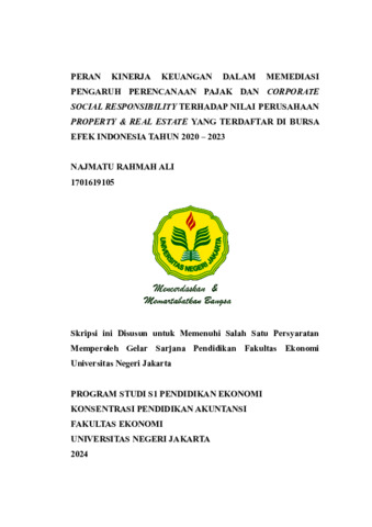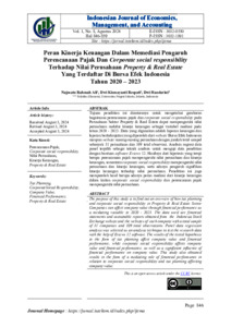 Najmatu Rahmah Ali, 2024: Peran kinerja keuangan dalam memediasi pengaruh perencanaan pajak dan corporate social responsibility terhadap nilai perusahaan pada Perusahaan Sektor Property & Real Estate. Skripsi, Jakarta: Program Studi S1 Pendidikan Ekonomi konsentrasi Pendidikan Akuntansi, Fakultas Ekonomi, Universitas Negeri Jakarta. Tujuan penelitian ini di antaranya untuk mengetahui gambaran bagaimana perencanaan pajak dan corporate social responsibility pada Perusahaan Sektor Property & Real Estate dapat mempengaruhi nilai perusahaan melalui kinerja keuangan sebagai variabel mediasi pada tahun 2020 - 2023. Data yang digunakan adalah laporan keuangan dan laporan berkelanjutan yang diperoleh dari website Bursa Efek Indonesia maupun website masing-masing perusahaan dengan jumlah total sampel sebanyak 31 perusahaan dan 109 total observasi. Analisis regresi data panel digunakan dalam penelitian ini untuk menguji data penelitian dengan bantuan software Eviews 12. Hasil pengujian hipotesis menunjukkan bahwa perencanaan pajak berpengaruh terhadap nilai perusahaan dan kinerja keuangan, sedangkan corporate social responsibility berpengaruh terhadap nilai perusahaan dan kinerja keuangan, serta kinerja keuangan berpengaruh signifikan terhadap nilai perusahaan. Hasil penelitian menunjukkan bahwa kinerja keuangan berperan dalam memediasi pengaruh corporate social responsibility terhadap nilai perusahaan, dan dapat memediasi pengaruh perencanaan pajak terhadap nilai perusahaan. Hasil penelitian ini menunjukkan bahwa corporate social responsibility merupakan bentuk investasi jangka panjang yang dilakukan perusahaan guna memberikan jaminan akan kelangsungan operasional perusahaan di masa yang akan datang, sedangkan perencanaan pajak yang efektif akan memberikan dampak terhadap kondisi keuangan perusahaan apabila dilakukan dengan tetap berdasar pada undangundang. Kata kunci: perencanaan pajak, corporate social responsibility, kinerja keuangan, nilai perusahaan, perusahaan sektor Property & Real Estate