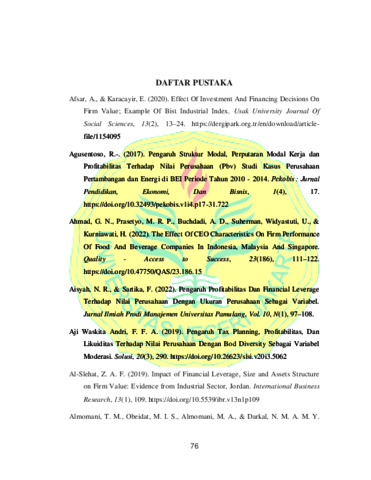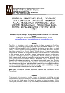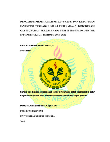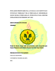 ABSTRAK Kris Fachuriyanti Atmadja, 2024; Pengaruh Profitabilitas, Leverage, dan Keputusan Investasi Terhadap Nilai Perusahaan Dimoderasi oleh Ukuran Perusahaan: Penelitian Pada Sektor Infrastruktur Periode 2017-2022. Skripsi, Jakarta : Konsentrasi Keuangan, Program Studi S1 Manajemen, Fakultas Ekonomi, Universitas Negeri Jakarta. Tim Pembimbing: Prof. Agung Dharmawan Buchdadi, M.M., Ph.D., & M. Edo Suryawan Siregar, S.E., M.B.A. Penelitian ini bertujuan untuk menguji apakah terdapat pengaruh profitabilitas, leverage, dan keputusan investasi terhadap nilai perusahaan sektor infrastruktur yang terdaftar di BEI periode 2017-2022. Profitabilitas diproksikan dengan Return on Asset (ROA), Leverage diproksikan dengan Debt to Equity Ratio (DER), Keputusan Investasi diproksikan dengan Price Earning Ratio (PER) dan Ukuran Perusahaan diproksikan dengan SIZE. Penelitian ini menggunakan 19 perusahaan infrastruktur yang terdaftar di BEI sebagai sampel penelitian. Metode pengambilan sampel menggunakan purposive sampling sesuai kriteria yang ditentukan. Teknik analisis yang digunakan ialah analisis regresi data panel. Penelitian ini menggunakan sampel tambahan yaitu pembagian periode menjadi 2017-2019 dan 2020-2022 sebagai pembanding. Hasil penelitian menunjukan profitabilitas dan leverage berpengaruh positif dan signfikan terhadap nilai perusahaan. Kemudian, keputusan investasi memiliki pengaruh positif dan tidak signifikan terhadap nilai perusahaan. Sedangkan untuk variabel moderasi, ukuran perusahaan, tidak dapat memoderasi hubungan antara profitabilitas, leverage, maupun keputusan investasi terhadap nilai perusahaan. Kata kunci: Profitabilitas, Leverage, Keputusan Investasi, Nilai Perusahaan, Ukuran Perusahaan.