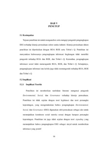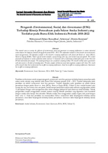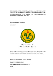 ABSTRAK Muhammad Zidane Ramadhan, 2024; Pengaruh Environmental, Social, dan Governance (ESG) terhadap Kinerja Perusahaan pada Sektor Aneka Industri yang terdaftar pada Bursa Efek Indonesia periode 2018 – 2022. Skripsi, Jakarta: Program Studi S1 Manajemen, Fakultas Ekonomi, Universitas Negeri Jakarta. Tim Pembimbing Prof. Dr. Suherman, M.Si. & Destria Kurnianti, SE, M.Sc. Penelitian ini bertujuan untuk menguji pengaruh environmental, social dan governance terhadap kinerja perusahaan pada sektor aneka industri yang terdaftar pada Bursa Efek Indonesia periode 2018 – 2022. Variabel independen pada penelitian ini adalah environmental, social dan governance. Variabel dependen pada penelitian ini adalah kinerja perusahaan dengan proksi Return on Assets (ROA), Return on Equity (ROE), Tobin’s Q dan variabel kontrol yaitu leverage, firm size, asset turnover, dan asset growth. Jumlah sampel perusahaan sektor aneka industri yang digunakan adalah 12 perusahaan dengan waktu pengamatan lima tahun sehingga terdapat 60 total observasi untuk dianalisis. Teknik pengambilan sampel menggunakan metode purposive sampling. Metode penelitian yang digunakan yaitu kuantitatif dengan sumber data berupa data sekunder. Metode analisis data menggunakan analisis regresi data panel dengan Stata versi 17. Hasil dari penelitian ini menunjukkan bahwa environmental tidak berpengaruh terhadap kinerja perusahaan. Social tidak berpengaruh terhadap kinerja perusahaan. Governance tidak berpengaruh terhadap kinerja perusahaan. Kata kunci: Environmental, Social, Governance, ROA, ROE, Tobins’ Q, Aneka Industri.