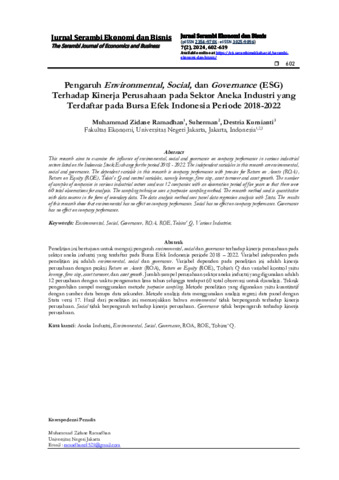 Zidane Ramadhan, Muhammad (2024) PENGARUH ENVIRONMENTAL, SOCIAL DAN GOVERNANCE (ESG) TERHADAP KINERJA PERUSAHAAN PADA SEKTOR ANEKA INDUSTRI YANG TERDAFTAR PADA BURSA EFEK INDONESIA PERIODE 2018-2022. S1 thesis, Universitas Negeri Jakarta.