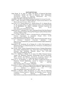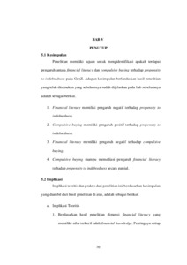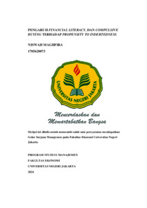 ABSTRAK Niswah Maghfira, 2024; Pengaruh Financial Literacy dan Compulsive Buying terhadap Propensity to Indebtedness. Skripsi, Jakarta: Program S1 Manajemen, Fakultas Ekonomi, Universitas Negeri Jakarta. Tim Pembimbing Prof. Dr. Umi Widyastuti, S.E., M.E. dan Dicky Iranto, S.E, M.S.E. Penelitian ini bertujuan untuk menguji pengaruh variabel financial literacy dan variabel compulsive buying terhadap variabel propensity to indebtedness pada masyarakat GenZ dengan metode kuantitatif. Responden dalam penelitian ini sebanyak 134 dengan kriteria pengguna paylater dan memiliki kegemaran dalam berbelanja. Teknik pengambilan data pada penelitian adalah purposive sampling dengan metode analisis yang digunakan ialah Partial Least Square - Structural Equation Model (PLS-SEM). Hasil penelitian menunjukkan bahwa financial literacy memiliki hubungan yang negatif terhadap propensity to indebtedness, compulsive buying memiliki hubungan yang positif terhadap propensity to indebtedness, financial literacy memiliki hubungan yang negatif terhadap compulsive buying, dan compulsive buying memediasi secara parsial financial literacy terhadap propensity to indebtedness. Kata Kunci: Propensity to Indebtedness, Financial Literacy, Compulsive Buying