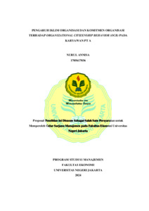 ABSTRAK Nurul Annisa, 2024; Pengaruh Iklim Organisasi dan Komitmen Organisasi terhadap Organizational Citizenship Behavior (OCB) pada Karyawan PT A. Skripsi, Jakarta: Konsentrasi Manajemen Sumber Daya Manusia, Program Studi S1 Manajemen, Fakultas Ekonomi, Universitas Negeri Jakarta. Tim Pembimbing: Dr. Agung Wahyu Handaru, S.T., M.M. dan Dr. Despinur Dara, S.T., M.M. Penelitian kali ini dilakukan dengan tujuan untuk mengetahui apakah terdapat pengaruh iklim organisasi terhadap Organiational Citizenship Behavior (OCB) pada karyawan PT A, untuk mengetahui pengaruh dan komitmen organisasi terhadap Organiational Citizenship Behavior (OCB) pada karyawan PT A, serta pengaruh secara bersamaan iklim organisasi dan komitmen organisasi terhadap Organizational Citizenship Behavior (OCB) pada karyawan PT A. Penelitian ini menggunakan karyawan PT A sebagai populasi, dengan menggunakan perhitungan besarnya sampel dengan rumus slovin maka di ketahui besarnya sampel yang di gunakan pada penelitian ini ialah sebesar 113 orang karyawan PT A. Adapun teknik pengambilan sampel yang digunakan yakni Purposive sampling. Data penelitian dihimpun dengan menyebarkan angket kuesioner melalui google form yang sebelumnya telah berisi pernyataan yang mewakili variabel penelitian. Teknik analisis data yang digunakan adalah dengan analisis regresi linear dan uji hipotesa. Berdasarkan hasil uji T penelitian diketahui bahwa iklim organisasi memiliki pengaruh positif dan signifikan terhadap perilaku OCB Karyawan PT A . Kemudian Komitmen organisasi juga diketahui berpengaruh positif dan signifikan terhadap sikap OCB pada karyawan PT A. Berdasarkan hasil uji F diketahui pula secara simultan iklim organisasi dan komitmen organisasi secara bersama-sama memberikan pengaruh positif dan signifikan terhadap sikap OCB Karyawan PT A. Dari hasil penelitian tersebut maka dapat dikatakan bawa iklim organisasi yang positif dan komitmen kerja yang tinggi dirasakan oleh karyawan akan meningkatkan sikap OCB karyawan tersebut. Sehingga perusahaan harus senantiasa melakukan upaya agar iklim organisasi tercipta dengan baik dan peningkatan komitmen karyawan. Kata Kunci: Iklim Organisasi, Komitmen Organisasi, Organiational Citizenship Behavior (OCB)