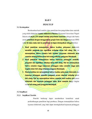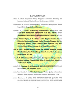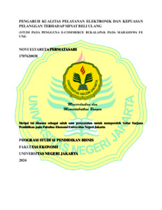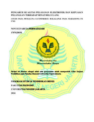 Novi Elvareta Permatasari, 1707620038. Pengaruh Kualitas Pelayanan Elektronik dan Kepuasan Pelanggan Terhadap Minat Beli Ulang (studi pada pengguna E-Commerce Bukalapak pada Mahasiswa FE UNJ. Skripsi Jakarta: Program Studi S1 Pendidikan Bisnis, Fakultas Ekonomi, Universitas Negeri Jakarta, Juni 2024 Tujuan penelitian ini adalah untuk mengetahui dan menganalisis Pengaruh Kualitas Pelayanan Elektronik dan Kepuasan Pelanggan terhadap Minat Beli Ulang. Metode penelitian yang dilakukan adalah penelitian kuantitatif dimana variabel diukur dengan metode pengumpulan data, survei berupa kuesione. Penelitian dilakukan dengan menggunakan sampel validitas dan reliabilitas sebanyak 30 orang. Sedangkan untuk sampel penelitian sebanyak 234 orang dengan menggunakan metode slovin. Pengolahan data menggunakan perangkat lunak SPSS versi 26. Adapun teknik analisis data dengan menggunakan uji asumsi klasik, analisis regresi linier berganda, pengujian hipotesis, dan koefisien determinasi. Hasil penelitian menunjukkan bahwa kualitas pelayanan elektronik memiliki pengaruh dan signifikan terhadap minat beli ulang. Kualitas kepuasan pelanggan memiliki pengaruh dan signifikan terhadap minat beli ulang. Kualitas pelayanan elektronik dan kepuasan pelanggan memiliki pengaruh secara simultan terhadap minat beli ulang. Kata Kunci : Kualitas Pelayanan Elektroni, Kepuasan Pelanggan, Minat Beli ulang