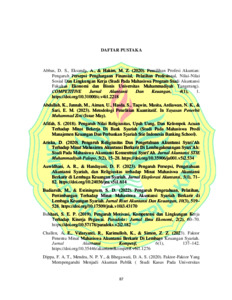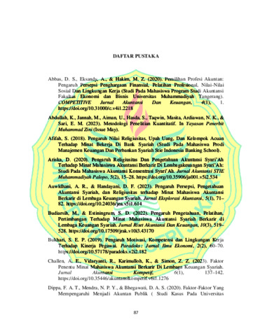 DELLA PUTRI RAMANDHA. Pengaruh Religiusitas, Lingkungan Kerja dan Pengetahuan Akuntansi Syariah terhadap Minat Berkarier di Sektor Perbankan Syariah, Skripsi, Jakarta: Fakultas Ekonomi, Universitas Negeri Jakarta, 2024.Tujuan dari penelitian ini adalah untuk mengetahui dan menganalisis bagaimana pengaruh religiusitas, lingkungan kerja, dan pengetahuan akuntansi syariah terhadap minat berkarier di sektor perbankan syariah. Sumber data yang digunakan dalam penelitian ini adalah data primer, kuesioner didistribusikan kepada mahasiswa aktif Program Studi S1 Akuntansi Universitas Negeri Jakarta dengan menggunakan Google Form. Analisis data pada penelitian ini menggunakan model analisis regresi linear berganda. Hasil penelitian menunjukan bahwa religiusitas dan lingkungan kerja memiliki pengaruh terhadap minat mahasiswa berkarier di sektor perbankan syariah. Sementara pengetahuan akuntansi syariah tidak berpengaruh terhadap minat mahasiswa untuk berkarier di sektor perbankan syariah. Penelitian ini juga diharapkan memberikan implikasi praktis bagi mahasiswa yang ingin berkarier di sektor perbankan syariah bahwa untuk meningkatkan religiusitas dan mempertimbangkan lingkungan kerja serta memiliki pengetahuan akuntansi syariah yang baik dapat mengikuti kegiatan keagamaan, seminar atau talk show, dan job fair sehingga mahasiswa Akuntansi Fakultas Ekonomi Universitas Negeri Jakarta semakin tertarik untuk berkarier di sektor perbankan syariah yang ada di Indonesia. Kata kunci: karier, lingkungan kerja, pengetahuan akuntansi syariah, religiusitas, sektor perbankan syariah.