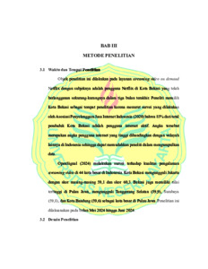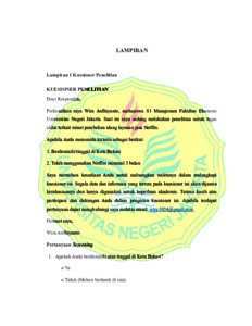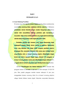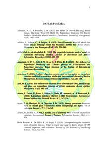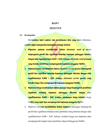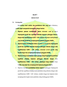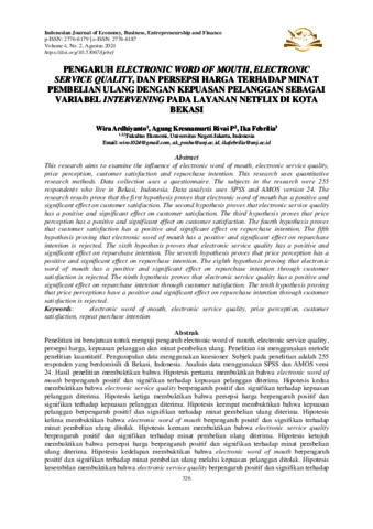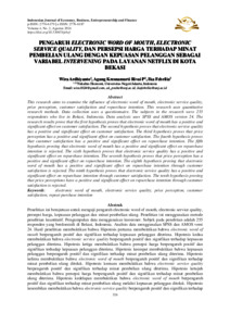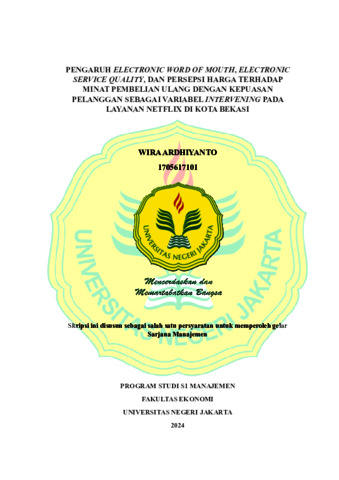 ABSTRAK Wira Ardhiyanto, pengaruh electronic word of mouth, electronic service quality, dan persepsi harga terhadap minat pembelian ulang dengan kepuasan pelanggan sebagai variabel intervening pada layanan Netflix di Kota Bekasi. Skripsi. Jakarta: Program Studi S1 Manajemen, Fakultas Ekonomi, Universitas Negeri Jakarta, Tim Pembimbing: Agung Kresnamurti Rivai P., ST., MM. & Ika Febrilia, SE., MM. Penelitian ini berujutuan untuk menguji pengaruh electronic word of mouth, electronic service quality, persepsi harga, kepuasan pelanggan dan minat pembelian ulang. Penelitian ini menggunakan metode penelitian kuantitatif. Pengumpulan data menggunakan kuesioner. Subjek pada penelitian adalah 255 responden yang berdomisili di Bekasi, Indonesia. Analisis data menggunakan SPSS dan AMOS versi 24. Hasil penelitian membuktikan bahwa Hipotesis pertama membuktikan bahwa electronic word of mouth berpengaruh positif dan signifikan terhadap kepuasan pelanggan diterima. Hipotesis kedua membuktikan bahwa electronic service quality berpengaruh positif dan signifikan terhadap kepuasan pelanggan diterima. Hipotesis ketiga membuktikan bahwa persepsi harga berpengaruh positif dan signifikan terhadap kepuasan pelanggan diterima. Hipotesis keempat membuktikan bahwa kepuasan pelanggan berpengaruh positif dan signifikan terhadap minat pembelian ulang diterima. Hipotesis kelima membuktikan bahwa electronic word of mouth tidak berpengaruh positif minat pembelian ulang. Hipotesis keenam membuktikan bahwa electronic service quality berpengaruh positif dan signifikan terhadap minat pembelian ulang diterima. Hipotesis ketujuh membuktikan bahwa persepsi harga berpengaruh positif dan signifikan terhadap minat pembelian ulang diterima. Hipotesis kedelapan membuktikan bahwa electronic word of mouth tidak berpengaruh berpengaruh terhadap minat pembelian ulang melalui kepuasan pelanggan. Hipotesis kesembilan membuktikan bahwa electronic service quality berpengaruh positif dan signifikan terhadap minat pembelian ulang melalui kepuasan pelanggan diterima. Hipotesis kesepuluh membuktikan bahwa persepsi harga tidak berpengaruh terhadap minat pembelian ulang melalui kepuasan pelanggan. Kata kunci: electronic word of mouth, electronic service quality, persepsi harga, kepuasan pelanggan, minat pembelian ulang.