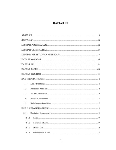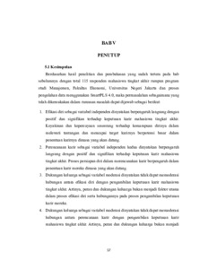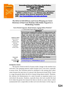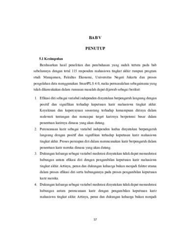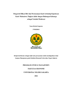 ABSTRAK Yanes Heykel Sopacua, 2024; Pengaruh Efikasi Diri dan Perencanaan Karir terhadap Keputusan Karir Mahasiswa Tingkat Akhir dengan Dukungan Keluarga sebagai Variabel Moderasi. Skripsi, Jakarta: Konsentrasi Sumber Daya Manusia, Program Studi S1 Manajemen, Fakultas Ekonomi, Universitas Negeri Jakarta. Tim Pembimbing: Dr. Budi Santoso, M.M. & Dr. Agung Wahyu Handaru, S.T., M.M. Tingkat pengangguran terbuka di Jakarta yang merupakan lulusan perguruan tinggi pada kenyataannya masih tinggi. Mahasiswa sebagai instrumen pendidikan diharapkan mampu bersaing dan memutuskan dengan pasti pilihan karirnya setelah lulus. Salah satu aspek yang harus dipersiapkan sebelum lulus adalah persiapan dan keyakinan mereka akan kemampuannya. Penelitian ini bertujuan untuk menganalisis pengaruh variabel endogen yaitu Efikasi Diri dan Perencanaan Karir dengan Dukungan Keluarga sebagai moderator kepada variabel eksogen yaitu Keputusan Karir Mahasiswa Tingkat Akhir. Penelitian ini menggunakan metode Structural Equation Modeling (SEM) dengan alat analisis Partial Least Square (PLS). Populasi dalam penelitian ini merupakan mahasiswa tingkat akhir rumpun program studi Manajemen, Fakultas Ekonomi, Universitas Negeri Jakarta. Hasil penelitian ini menunjukkan bahwa (1) Efikasi diri dan perencanaan karir mempunyai pengaruh positif dan signifikan terhadap keputusan karir mahasiswa tingkat akhir. (2) Dukungan keluarga sebagai moderator tidak berpengaruh dalam hubungan antara efikasi diri dan perencanaan karir terhadap keputusan karir mahasiswa tingkat akhir. (3) Universitas dan keluarga memiliki pengaruh penting dalam persiapan dan keyakinan diri mahasiswa tingkat akhir. Berdasarkan hasil penelitian, maka universitas diharapkan dapat memberikan kesempatan bagi semua mahasiswa lebih aktif dalam belajar di kelas serta dapat memberikan informasi lebih terkait studi lanjut maupun karir dalam bentuk seminar atau career-fair, dan untuk keluarga diharapkan untuk memiliki waktu bagi mahasiswa untuk berbagi kesulitan selama berkuliah serta memberikan penghargaan atas setiap pencapaian mahasiswa. Kata kunci: Efikasi Diri, Perencanaan Karir, Dukungan Keluarga, Keputusan Karir