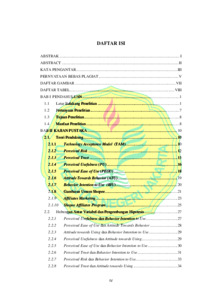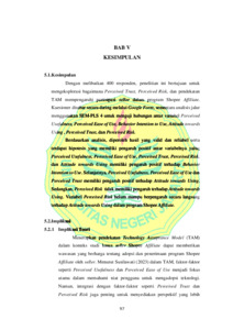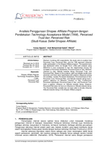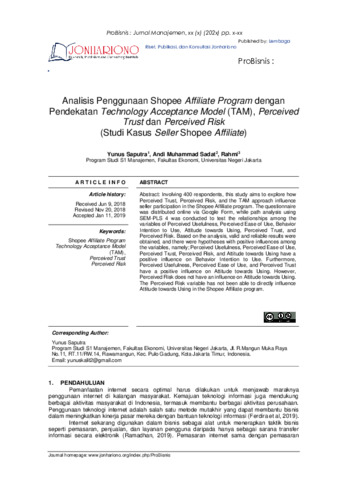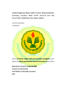 ABSTRAK Yunus Saputra; “Analisis Penggunaan Shopee Affiliate Program dengan Pendekatan Technology Acceptance Model (TAM), Perceived Trust dan Perceived Risk pada studi kasus Seller Shopee affiliate di DKI Jakarta” Skripsi, Jakarta: Program Studi Manajemen, Fakultas Ekonomi, Universitas Negeri Jakarta. Tim pembimbing: Andi Muhammad Sadat, SE., M.Si., Ph.D dan Rahmi, S.E., M.S.M Tujuan dari penelitian ini adalah untuk menguji pengaruh: 1) Perceived Usefulness terhadap Behavior Intention to Use. 2) Perceived Ease of Use terhadap Attitude towards Using. 3) Attitude towards Using terhadap Behavior Intention to Use. 4) Perceived Usefulness terhadap Attitude towards Using. 5) Perceived Ease of Use terhadap Behavior Intention to Use . 6) Perceived Trust terhadap Behavior Intention to Use. 7) Perceived Risk terhadap Behavior Intention to Use. 8) Perceived Trust terhadap Attitude towards Using. 9) Perceived Risk terhadap Attitude towards Using. Metode pengumpulan data menggunakan survei dengan instrumen berupa kuesioner yang disebarkan secara online. Teknik pengambilan sampel yang digunakan dalam penelitian ini adalah teknik non-probability sampling. Responden adalah mereka yang pernah melalukan transaksi sebanyak tiga kali dalam tiga bulan terakhir pada Shopee affiliate. Sebanyak 400 responden dilibatkan, data dianalisis dengan menggunakan SEM-PLS 4. Hasil penelitian ini menunjukkan bahwa Perceived Usefulness, Perceived Ease of Use, Perceived Trust, Perceived Risk, dan Attitude towards Using memiliki pengaruh positif terhadap Behavior Intention to Use. Selanjutnya, Perceived Usefulness, Perceived Ease of Use dan Perceived Trust memiliki pengaruh positif terhadap Attitude towards Using. Sedangkan, Perceived Risk tidak memiliki pengaruh terhadap Attitude towards Using. Kata Kunci: Perceived Usefulness, Perceived Ease of Use, Perceived Trust, Perceived Risk, Attitude towards Using, Behavior Intention to Use
