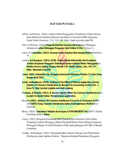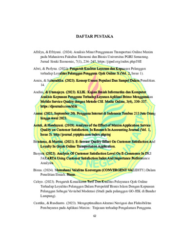 ABSTRAK David Saputra Barasa, 2024; Analisis Kepuasan Pengguna Layanan Ride Hailing Maxim di Jabodetabek. Skripsi, Jakarta: Program Studi D4 Pemasaran Digital, Fakultas Ekonomi, Universitas Negeri Jakarta Maxim adalah salah satu perusahaan layanan ride-hailing paling populer di Indonesia dengan jumlah pengunduh di playstore dibandingkan aplikasi ride-hailing lainnya. Dengan memperhatikan kualitas layann dan harga sebagai bentuk mempertahankan kepuasan pelanggan. Penelitian ini bertujuan untuk mengidentifikasi faktor-faktor yang dapat meningkatkan kepuasan pelanggan pengguna layanan ride-hailing Maxim di Jakarta, Bogor, Depok, Tanggerang, Bekasi (Jabodetabek). Metode penelitian yang digunakan adalah pendekatan kuantitatif dengan metode survei. Populasi dalam penelitian ini terdiri dari individu yang pernah menggunakan layanan ride-hailing Maxim. Sampel diambil dengan teknik purposive sampling non-probability, dan data dikumpulkan melalui kuesioner online melalui Google Form yang disebar dalam penelitian ini adalah 122 responden yang memenuhi kriteria. Berdomisili di Jabodetabek, berusia 17-35 tahun keatas, dan merupakan pengguna Tokopedia. Uji validitas dan uji reliabilitas untuk menguji intrumen penelitian. Teknik analisis yang digunakan adalah analisis deskriptif untuk mendeskripsikan data dan analisis Costumer Satisfaction Index (CSI) untuk mengidentifikasi faktor-faktor yang membentuk kepuasan pelanggan. Dimensi yang digunakan adalah performance, ekonomi, perceived of usefulness dan ease of use. Adapun kesimpulan penelitian ini hasil analisis Costumer Satisfaction Index (CSI) telah mengidentifikasi faktor yang membentuk kepuasan pelanggan pengguna layanan Maxim yaitu performance, ekonomi, perceived of usefulness dan ease of use. Kata Kunci: Kepuasan Pelanggan, Maxim, Costumer Satisfaction Index