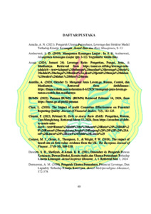 ESTER BETANIA SALIM, Pengaruh Komite Audit, Ukuran Perusahaan, dan Leverage Terhadap Kinerja Keuangan BUMN. Fakultas Ekonomi, Universitas Negeri Jakarta, 2024. Tujuan dalam penelitian ini adalah menguji dan menganalisis serta mengetahui pengaruh komite audit, ukuran perusahaan, dan leverage terhadap kinerja keuangan Badan Usaha Miliki Negara. Teknik pengambilan sampel dalam penelitian ini menggunakan non-probability sampling melalui purposive sampling sehingga diperoleh 137 perusahaan yang memenuhi kriteria. Penelitian ini menggunakan sumber data sekunder yaitu melalui laporan keuangan BUMN yang ada pada periode 2020-2022. Teknik analisis data yang digunakan dalam penelitian ini adalah analisis regresi linear berganda dengan menggunakan alat bantu program statistik berupa SPSS versi 25. Penelitian ini memperoleh hasil sebagai berikut: (a) Komite audit tidak berpengaruh terhadap kinerja keuangan BUMN; (b) Ukuran Perusahaan memiliki pengaruh positif dan signifikan terhadap kinerja keuangan BUMN; (c) Leverage memiliki pengaruh negatif dan signifikan terhadap kinerja keuangan BUMN. Implikasi dari penelitian ini adalah bahwa manajemen BUMN perlu memperhatikan faktor ukuran perusahaan sebagai salah satu penentu utama kinerja keuangan yang positif. Peningkatan ukuran perusahaan dapat dilakukan melalui strategi ekspansi dan peningkatan efisiensi operasional. Selain itu, manajemen juga harus berhati-hati dalam mengelola leverage, karena tingkat leverage yang tinggi dapat berdampak negatif terhadap kinerja keuangan. Meskipun komite audit tidak menunjukkan pengaruh yang signifikan, tetap penting untuk memastikan bahwa komite audit menjalankan fungsinya dengan baik untuk menjaga tata kelola perusahaan yang baik dan transparansi. Kata Kunci: Komite Audit, Ukuran Perusahaan, Leverage, dan Kinerja Keuangan