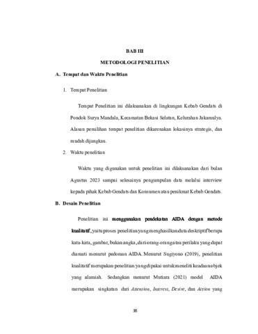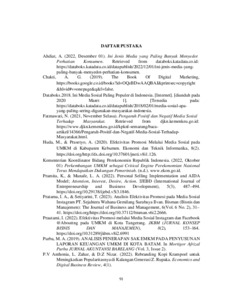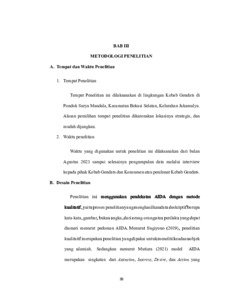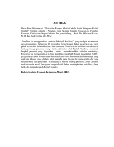 ABSTRAK Hario Bimo Wioskawuri “Efektivitas Promosi Melalui Media Sosial Instagram Kebab Gendats” Skripsi, Jakarta : Program Studi Sarjana Terapan Manajemen, Fakultas Ekonomi, Universitas Negeri Jakarta. Tim pembimbing : Prof. Dr. Mohamad Rizan, M.M. Dan Ika Febrillia S.E, M.M Penelitian ini menggunakan metode deskriptif kualitatif yang meliputi wawancara dan dokumentasi. Sebanyak 13 responden berpartisipasi dalam penelitian ini, yaitu pihak terkait dari Kebab Gendats, dan konsumen. Penelitian ini memberikan informasi tentang strategi promosi yang telah dilakukan oleh Kebab Gendats, termasuk langkah promosi yang digunakan untuk memaksimalkan aktivitas marketing. Penelitian ini menggunakan metode penelitian kualitatif dengan pendekatan AIDA, yang nantinya akan menemukan dan memahami suatu fenomena dan konteksnya yang unik dan khusus yang dialami oleh individu pada tingkat keyakinan individu yang terlibat. Hasil dari penelitian menunjukkan bahwa strategi promosi Kebab Gendats melalui media sosial Instagram sangat efektif dalam meningkatkan visibilitas, daya tarik, dan penjualan pada Kebab Gendats. Kebab Gendats, Promosi, Instagram, Model AIDA
