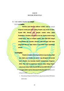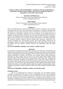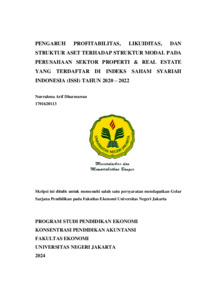 NURRAHMA ARIF DHARMAWAN. Pengaruh Profitabilitas, Likuiditas, dan Struktur Aset Terhadap Struktur Modal Pada Perusahaan Sektor Properti & Real Estate yang Terdaftar di Indeks Saham Syariah Indonesia (ISSI) Tahun 2020 – 2022. Skripsi, Jakarta: Program Studi Pendidikan Ekonomi, Konsentrasi Pendidikan Akuntansi, Fakultas Ekonomi, Universitas Negeri Jakarta, 2024. Penelitian ini bertujuan untuk mengevaluasi dampak Profitabilitas, Likuiditas, dan Struktur Aset terhadap Struktur Modal perusahaan-perusahaan di sektor properti dan real estate yang tercatat dalam Indeks Saham Syariah Indonesia (ISSI) di Bursa Efek Indonesia selama periode 2020 hingga 2022. Penelitian ini melibatkan 55 perusahaan sebagai populasi, dengan teknik pengambilan sampel menggunakan metode purposive sampling, menghasilkan 48 perusahaan sebagai sampel. Metode analisis data yang diterapkan mencakup regresi linier berganda, uji prasyarat, uji asumsi klasik, dan pengujian hipotesis. Analisis data dilakukan menggunakan Software IBM SPSS Statistic, dan hasil penelitian menunjukkan bahwa likuiditas dan struktur aset memiliki pengaruh negatif dan signifikan terhadap struktur modal, sedangkan profitabilitas memiliki pengaruh negatif namun tidak signifikan terhadap struktur modal. Kata kunci: profitabilitas, likuiditas, struktur aset, struktur modal