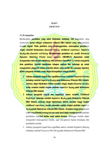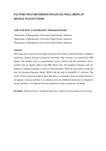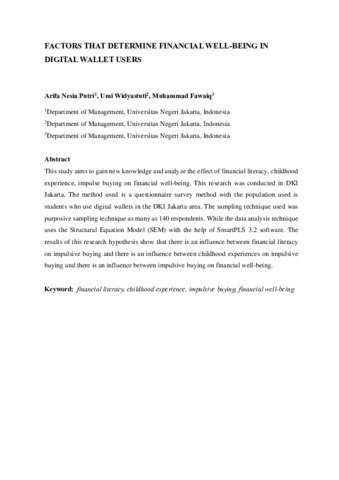 Arifa Nesia Putri. Faktor-Faktor yang Menentukan Kesejahteraan Keuangan Pada Pengguna Dompet Digital. Skripsi. Jakarta: Program Studi Pendidikan Bisnis, Fakultas Ekonomi, Universitas Negeri Jakarta. 2024 Penelitian ini bertujuan untuk mendapatkan pengetahuan baru dan menganalisis pengaruh financial literation, childhood experience, impulse buying terhadap financial well-being. Penelitian ini dilakukan di Wilayah DKI Jakarta selama enam bulan dari Desember 2023 sampai Juli 2024. Metode yang digunakan adalah metode survei kuesioner dengan populasi yang digunakan adalah mahasiswa yang menggunakan dompet digital di wilayah DKI Jakarta. Teknik pengambilan sampel yang digunakan adalah teknik purposive sampling dengan adanya kriteria tertentu. Total responden dalam penelitian ini sebanyak 140 orang, terdiri dari 41 responden laki-laki dan 99 responden Perempuan, yang merupakan mahasiswa Wilayah DKI Jakarta. Sedangkan teknik analisis data menggunakan Structural Equation Model (SEM) dengan bantuan software SmartPLS. Hasil hipotesis penelitian ini menunjukkan bahwa terdapat pengaruh negatif dan signifikan antara financial literacy terhadap impulsive buying, adanya pengaruh negatif dan signifikan antara childhood experience terhadap impulsive buying, dan terdapat pengaruh negatif dan signifikan antara impulsive buying terhadap financial well-being. Kata Kunci: financial literacy, childhood experience, impulsive buying, financial well-being