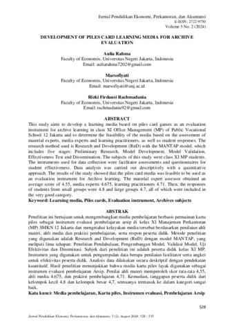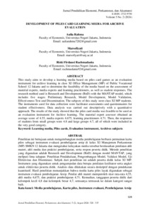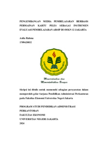 Aulia Rahma. 1709620032. Pengembangan Media Pembelajaran Kartu Piles Sebagai Instrumen Evaluasi Pembelajaran Arsip di SMKN 12 Jakarta. 2024. Penelitian ini bertujuan untuk mengembangkan media pembelajaran kartu piles sebagai Instrumen evaluasi pembelajaran Arsip pada kelas XI MP di SMKN 12 Jakarta, mengetahui kelayakan media pembelajaran kartu piles yang digunakan sebagai Instrumen evaluasi pembelajaran Arsip pada kelas XI MP di SMKN 12 Jakarta, berdasarkan ahli materi, ahli media, praktisi pembelajaran serta respons peserta didik Penelitian ini menggunakan metode Research and Development (RnD) dengan Model MANTAP yang meliputih lima tahapan, yaitu: Penelitian Pendahuluan, Pengembangan Model, Validasi Model, Uji Efetivitas dan Diseminasi. Mengingat terbatasnya waktu dan dana, penelitian ini hanya dilakukan sampai tahap ke empat. Pada tahap Uji Validasi Model, media pembelajaran berbasis permainan Kartu Piles dinilai oleh para ahli, ahli materi (dosen FE UNJ), ahli media (dosen FE UNJ), praktisi pembelajaran (guru kearsipan SMKN 12 Jakarta). Tahap uji efektivitas model, media pembelajaran berbasis permainan Kartu Piles dilakukan dua uji coba, uji coba kelompok kecil (uji terbatas) dan uji coba kelompok besar (uji pemakaian). Subjek penelitian ini adalah peserta didik kelas XI Manajemen Perkantoran. Instrumen pengumpulan data berupa lembar penilaian vasilitator serta lembar angket untuk uji efektivitas peserta didik. Teknik analisis data menggunakan analisis deskriptif kualitatif dengan pendekatan kuantitatif. Hasil penelitian ini menunjukkan bahwa Media Pembelajaran Berbasis Permainan Kartu Piles sebagai Instrumen Evaluasi Pembelajaran Arsip di SMK Negeri 12 Jakarta dinyatakan bahwa layak digunakan. Kelayakan media pembelajaran Kartu Piles sebagai instrumen evaluasi dinilai berdasarkan dari: a) ahli materi memperoleh rata-rata skor akhir 4,55 termasuk dalam kriteria Sangat Layak, b) ahli media memperoleh rata-rata skor akhir 4,675 termasuk dalam kriteria Sangat Layak, c) praktisi pembelajaran memperoleh rata-rata skor akhir 4,71 termasuk dalam kriteria Sangat Layak dan tanggapan peserta didik dari kelompok kecil memperoleh rata-rata skor akhir 4,8 termasuk dalam kriteria Sangat Layak dan uji coba pemakaian memperoleh rata-rata skor 4,7 termasuk dalam kriteria Sangat Layak. Kata Kunci: Media Pembelajaran, Kartu Piles, Instrumen Evaluasi Pembelajaran Kearsipan