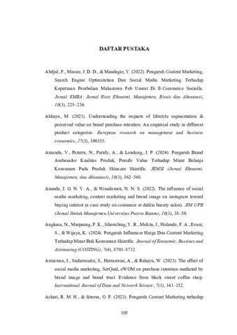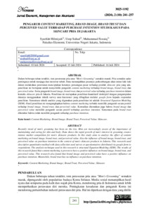 ABSTRAK Syarifah Hilmiyah, Pengaruh Content Marketing, Brand Image, Brand Trust dan Perceived Value Terhadap Purchase Intention pada Skincare Pria di Jakarta, Skripsi, Jakarta: Fakultas Ekonomi Universitas Negeri Jakarta, 2024 Dalam beberapa tahun terakhir, tren perawatan pria atau "Men's Grooming" semakin marak. Pria semakin sadar pentingnya untuk menjaga dan merawat tubuh. Data menunjukkan pesatnya perkembangan akan minat laki-laki dalam melakukan perawatan menciptakan ketatnya persaingan pasar terhadap produk skincare pria yang ada. penelitian ini bertujuan untuk menyelidiki pengaruh content marketing terhadap brand image, brand trust, dan perceived value. Serta pengaruh brand image, brand trust, dan perceived value terhadap purchase intention dalam konteks skincare pria di Jakarta. Penelitian ini merupakan penelitian kuantitatif deskriptif dengan pengumpulan datanya menggunakan teknik survey atau kuesioner yang dibagikan melalui google form kepada responden penelitian. Sementara teknik analisis yang digunakan pada penelitian ini adalah Structural Equation Modeling (SEM). Hasil penelitian ini mengungkapkan bahwa content marketing terbukti memiliki pengaruh secara positif terhadap brand image, brand trust, dan perceived value. Kemudian ditemukan juga bahwa brand image dan perceived value memiliki pengaruh secara positif terhadap purchase intention. Sementara pada brand trust diketahui bahwa tidak memiliki pengaruh terhadap purchase intention. Kata kunci: Content Marketing; Brand Image; Brand Trust; Perceived Value; Skincare