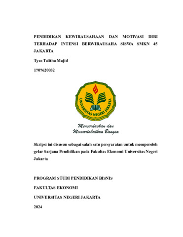Talitha Majid, Tyas (2024) PENDIDIKAN KEWIRAUSAHAAN DAN MOTIVASI DIRI TERHADAP INTENSI BERWIRAUSAHA SISWA SMKN 45 JAKARTA. S1 thesis, Universitas Negeri Jakarta.