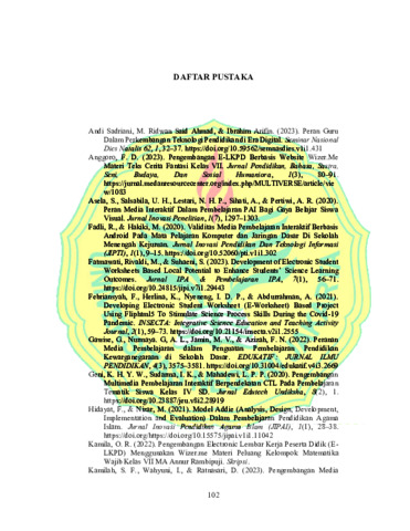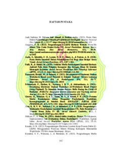 ABSTRAK Dini Pitaloka. 1709620088. Pengembangan Media Pembelajaran Interaktif Berbasis E-LKPD Berbantuan Website Wizer.me pada SMK Negeri 25 Jakarta. 2024 Penelitian ini bertujuan untuk mengetahui bagaimana proses dalam suatu pengembangan media E-LKPD, mengukur kelayakan media E-LKPD, dan mengukur keefektifan penggunaan E-LKPD. Penelitian ini menggunakan jenis Research & Development (R&D) dengan model ADDIE (Analysis, Design, Development, Implementation, Evaluation). Teknik pengumpulan data yang digunakan dalam penelitian pengembangan ini yaitu lembar validasi ahli, angket respon, dan instrumen tes. Teknik analisis data dalam penelitian ini menggunakan teknik analisis deskriptif kuantitatif dan teknik analisis kualitatif. Hasil kelayakan dari penilaian ahli materi mendapatkan 91,18%, ahli media mendapatkan 96,67%, dan respon siswa 91,11% sehingga rata-rata dari penilaian ahli dan siswa sebesar 93% yang termasuk kategori “Sangat Layak”. Keefektifan E-LKPD yang diperoleh dari hasil pengerjaan pre-test dan post-test selama pelaksanaan uji coba mendapatkan N-Gain sebesar 0,752 atau 75% dan termasuk kategori “Efektif”. Maka, E-LKPD Berbantuan Website Wizer.me dikatakan layak dan efektif digunakan dalam proses pembelajaran. Selain itu, E-LKPD ini dapat dijadikan sebagai alternatif media pembelajaran yang digunakan guru serta membantu guru dalam mengukur pemahaman siswa terkait materi ajar. Penelitian ini memiliki keterbatasan yaitu dari segi fitur yang belum sepenuhnya digunakan dan muatan materi yang tidak terlalu banyak sehingga peneliti selanjutnya dapat menyempurnakan E-LKPD berbantuan website wizer.me ini. Kata kunci : Media Pembelajaran Interaktif, E-LKPD, Wizer.me