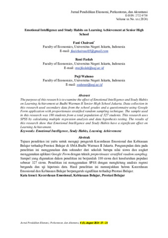 ABSTRAK Fani Chairani. 1709617037. Pengaruh Kecerdasan Emosional dan Kebiasaan Belajar terhadap Prestasi Belajar di SMA Budhi Warman II Jakarta. Skripsi. Jakarta: Fakultas Ekonomi, Universitas Negeri Jakarta, 2024. Pendidikan sangat penting bagi kehidupan setiap manusia, karena pendidikan dapat memberikan pengetahuan mengenai segala sesuatu yang ingin diketahui dan menyampaikan pandangan akan kehidupan. Dalam proses pendidikan di sekolah, belajar adalah cara seseorang untuk merubah perilaku, mengembangkan daya pikir dan pemahaman, serta meningkatkan pengetahuan, keterampilan, dan kemampuan lain yang dibutuhkan. Penelitian ini berawal dari munculnya isu tingkat kecerdasan emosional yang rendah dan kebiasaan belajar siswa yang kurang baik. Maka dari itu, penelitian bertujuan untuk mengetahui pengaruh kecerdasan emosional dan kebiasaan belajar terhadap prestasi belajar. Penelitian ini dilakukan pada populasi siswa-siswi di SMA Budhi Warman II Jakarta angkatan 2023/2024 dengan menggunakan teknik proportionate stratified random sampling dengan 180 sampel penelitian. Penelitian ini dilakukan pada bulan Juli 2023 s.d. Juni 2024. Metode penelitian ini dilakukan secara kuantitatif dengan metode survei melalui kuesioner dengan aplikasi Google Form. Penelitian ini menyimpulkan bahwa kecerdasan emosional dan kebiasaan belajar signifikan mempengaruhi prestasi belajar dengan nilai F hitung sebesar 54,780 > 3,05 dengan tingkat signifikansi 0,00 < 0,05 dan R2 (R Square) sebesar 0,375. Pada variabel kecerdasan emosional (X1) terhadap prestasi belajar (Y), hasil t hitung adalah 4,258 > t tabel 1,97346 dengan nilai Sig. 0,000 < 0,05. Pada variabel kebiasaan belajar (X2) terhadap prestasi belajar (Y), hasil t hitung adalah 8,102 > t tabel 1,97346 dengan nilai Sig. 0,000 < 0,05. Artinya terdapat pengaruh positif dan signifikan variabel Kecerdasan Emosional dan Kebiasaan Belajar terhadap variabel Prestasi Belajar. Jika semakin tinggi kecerdasan emosional dan kebiasaan belajar, maka dampaknya terhadap prestasi belajar pun akan meningkat. Kata kunci: kecerdasan emosional, kebiasaan belajar, prestasi belajar, pendidikan, siswa