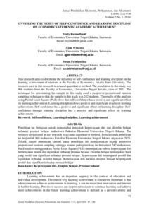ABSTRAK Fenty Ramadhanti, 1709620049, Pengaruh Kepercayaan Diri dan Disiplin Belajar terhadap Prestasi Belajar mahasiswa Fakultas Ekonomi Universitas Negeri Jakarta. Penelitian ini bertujuan untuk mengetahui pengaruh kepercayaan diri dan disiplin belajar terhadap prestasi belajar mahasiswa Fakultas Ekonomi Universitas Negeri Jakarta. Pada penelitian yang digunakan dalam penelitian ini adalah metode kuantitatif kausal. Populasi pada penelitian ini berjumlah 968 mahasiswa Fakultas Ekonomi Universitas Negeri Jakarta angakatan 2021. Teknik dalam penentuan sampel pada penelitian ini menggunakan teknik purposive proportional random sampling sehingga sampel pada penelitian ini berjumlah 242 mahasiswa. Hasil analisis menggunakan Partial Least Square (PLS) menunjukkan bahwa kepercayaan diri berpengaruh positif dan signifikan terhadap prestasi belajar. Disiplin belajar menunjukan hasil yang positif dan signifikan terhadap prestasi belajar. Kepercayaan diri berpengaruh positif dan signifikan terhadap disiplin belajar. Kepercayaan diri melalui disiplin belajar berpengaruh positif dan signifikan terhadap prestasi belajar. Kata kunci: Kepercayaan Diri, Disiplin Belajar, Prestasi Belajar